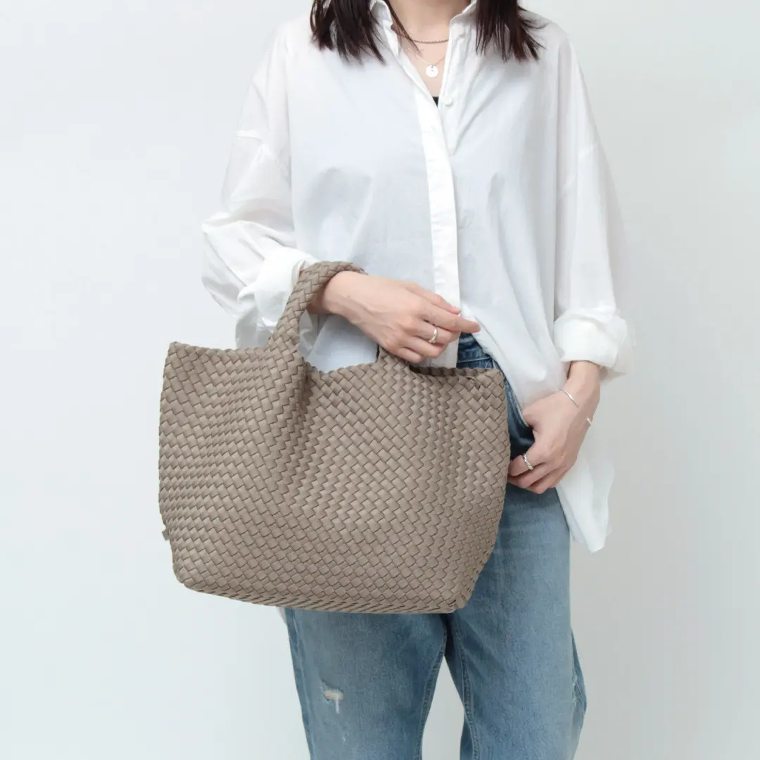 St. Barthsのラージサイズは、ナゲディの中でも最大容量を誇るトート型バッグ。1泊分の着替えや、ジム用のウェア、仕事+αの荷物まで余裕をもって収まるサイズ感です。荷物が増えてもシルエットが崩れにくく、「大きいのにだらしなく見えない」のがLサイズの強み。