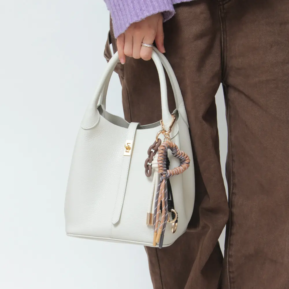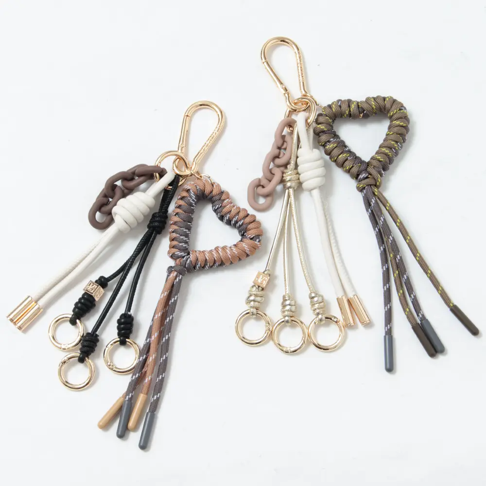 ハートモチーフのパラコードが目を引くバッグチャーム。 レザーコード、アクリルチェーン、カラビナ付きチャームを組み合わせたセットで、バッグにさりげないアクセントを添えてくれます。 シンプルなバッグにプラスするだけで、程よい遊び心と可愛らしさを演出できるアイテムです。