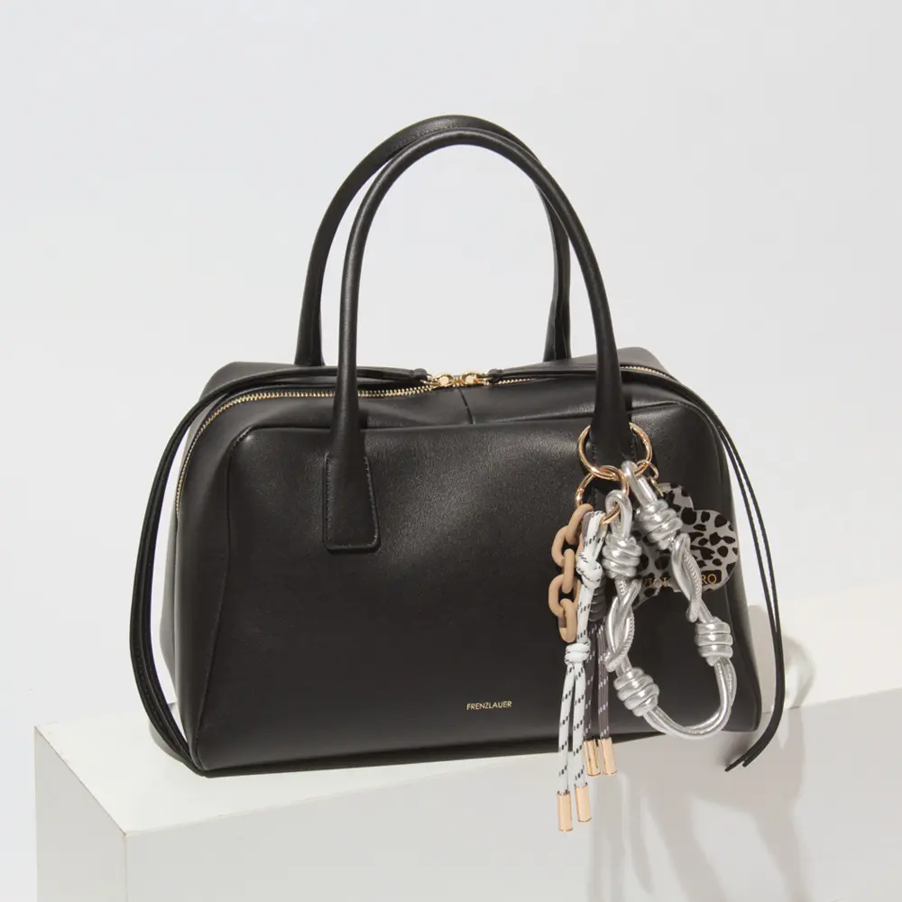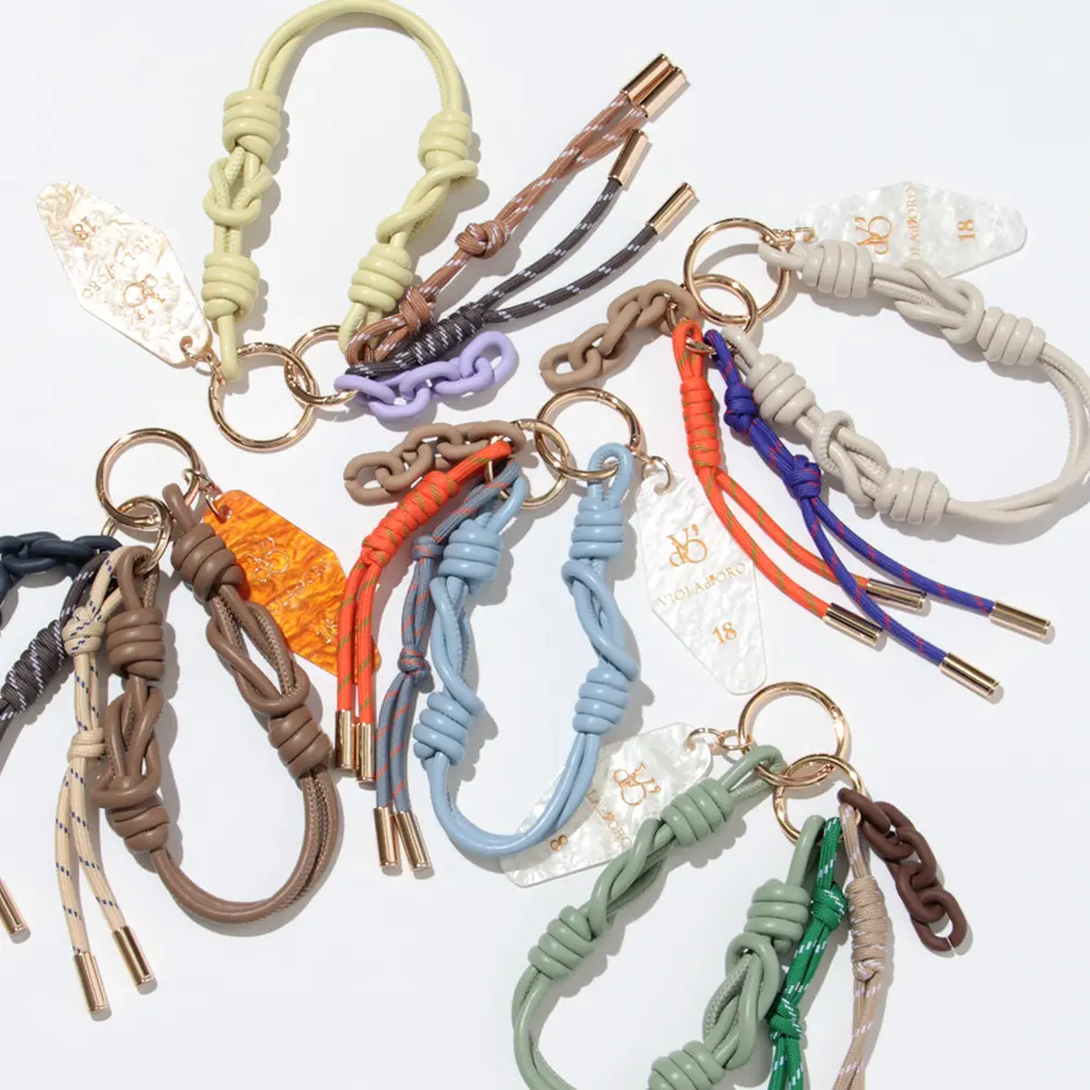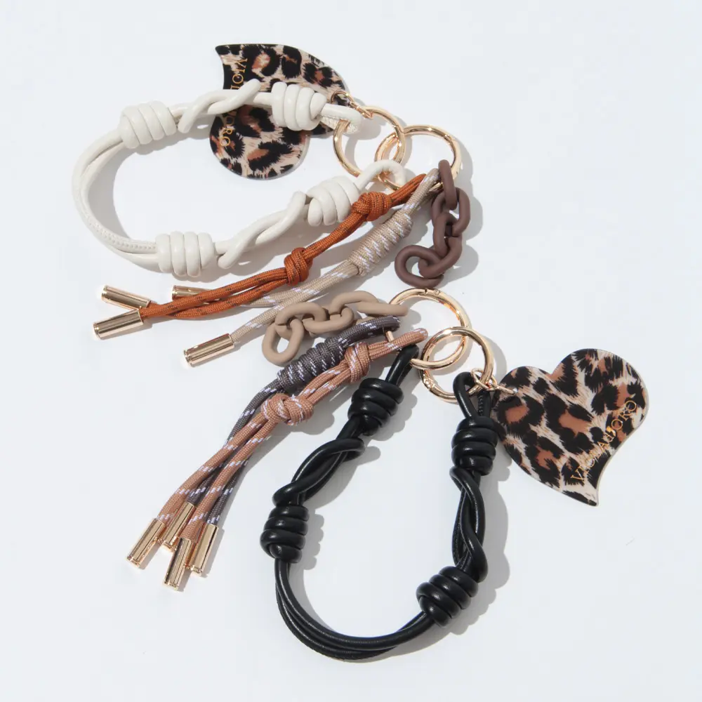 ブランドロゴ入りのアクリルパーツが目を引くバッグチャーム。 「レオパード」「ブリンドル」「キー」の3つのデザイン展開で、それぞれ異なる表情を楽しめます。 レザーコード、パラコード、プラスチックチェーンを組み合わせた仕様で、カラーコーディネートも魅力のひとつ。バッグに遊び心のあるアクセントを添えてくれるアイテムです。