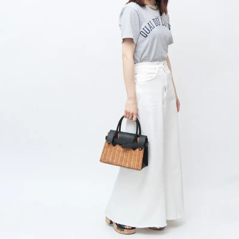 ウィッカー編みのラタンがナチュラルな雰囲気たっぷり"The Bagmati バグマティ"のカゴバッグ。かっちりスクエアシルエットにレザーフラップが、カジュアルになりすぎず大人な仕上がりです。