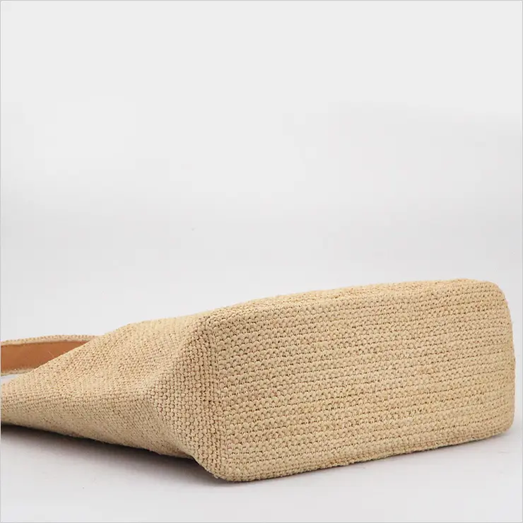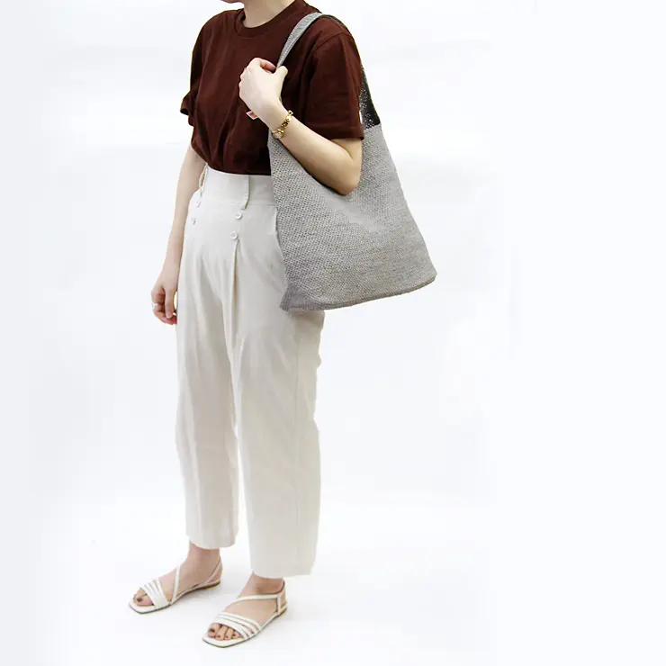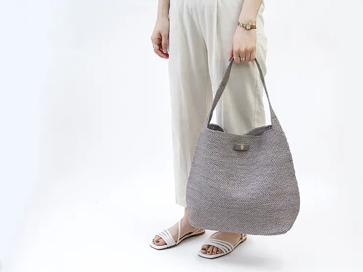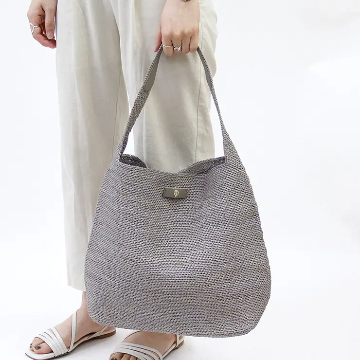 上質なラフィア素材を丁寧に編み込んだ、涼し気で夏らしいワンショルダーバッグ。クロシェ編みで一つ一つ丁寧に作られています。軽くて柔らかい素材なので、コンパクトに丸めることができて、旅行などのサブバッグとしても活躍します。