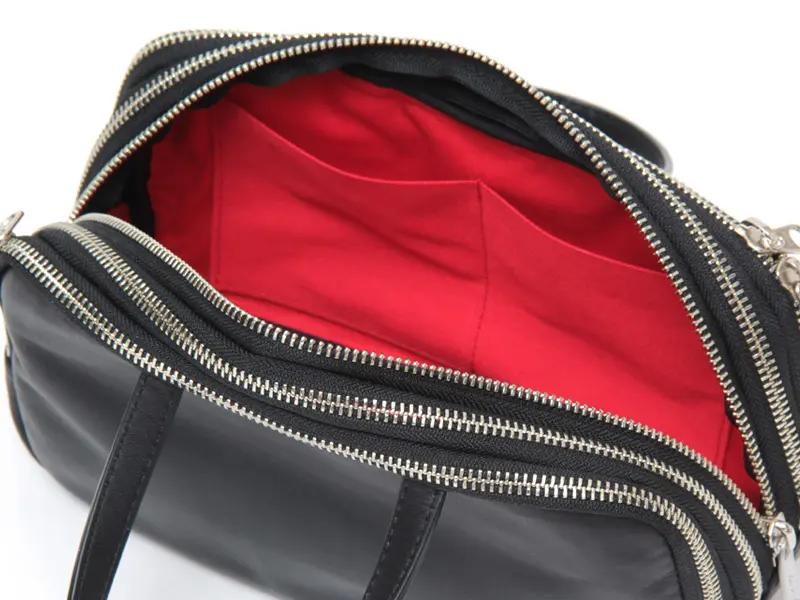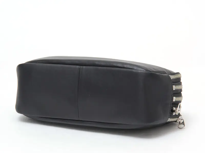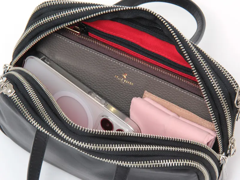 開閉はダブルファスナー仕様。5連結メタルジッパーはどこから開けても使えます。長財布やスマホ、ポーチなどお出かけの必需品が収納できます。 内側にはファスナーポケットとオープンポケットが付いており、鍵やスマホ、イヤホンなどの小物もスッキリと収納できます。