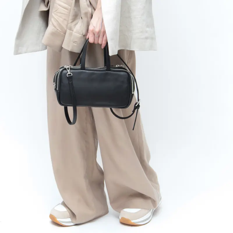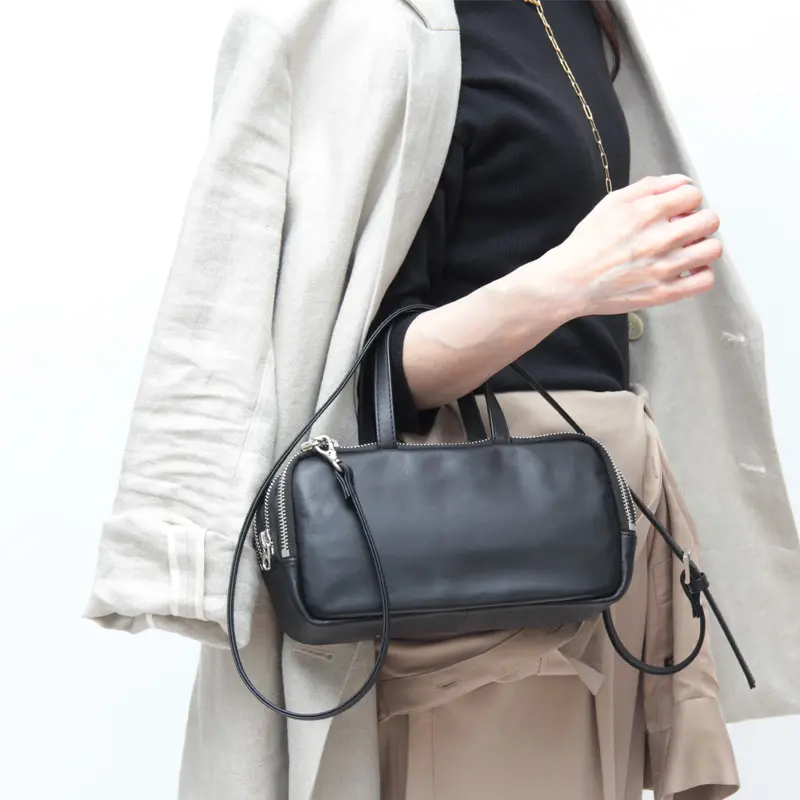 取り外し可能なショルダーストラップが付いており、斜めがけもできる2way仕様。ショッピングや旅行などアクティブなシーンでも気兼ねなくおしゃれが楽しめます。シャープなシルエットとコンパクトなサイズ感は、どんなスタイルにも合わせやすく、様々なシーンでお使いいただけます。