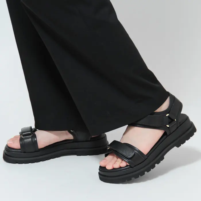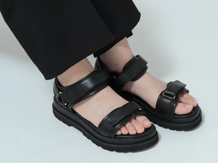 つま先は丸みを帯びたラウンドトゥ。甲部分のベルトがしっかりと足の動きを捉えてくれる、歩きやすいレザー仕立てのスポサンデザイン。オープントゥが涼しく、軽やかな印象。デザイン性と機能性を兼ね備え、綺麗めにもカジュアルにも好相性です。