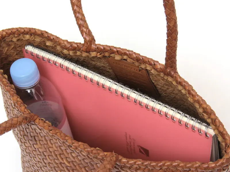 マチ幅が広く、長財布やポーチに加え、お弁当箱やペットボトルも収まり、お仕事バッグにも最適。ハンドルからサイド、底面までをすべてレザー紐で丁寧に編み上げたフォルムは、まるで一つのアートピースのよう。裏地のない軽やかなつくりで、本革ながら驚くほど軽量。バンダナやスカーフを添えれば、おしゃれに目隠しでき、防犯面も安心です。