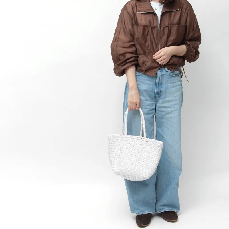 かごバッグの軽やかさと、本革ならではの上質な風合いを兼ね備えたメッシュレザーバッグ。春夏は涼しげな印象で、秋冬は抜け感のあるレザーアイテムとしてシーズンレスに活躍します。カジュアルからフェミニンまで、ワンピースやボリュームスカートとも好相性。日々のコーディネートに上品な抜け感を添えてくれる、頼れるプラスワンアイテムです。