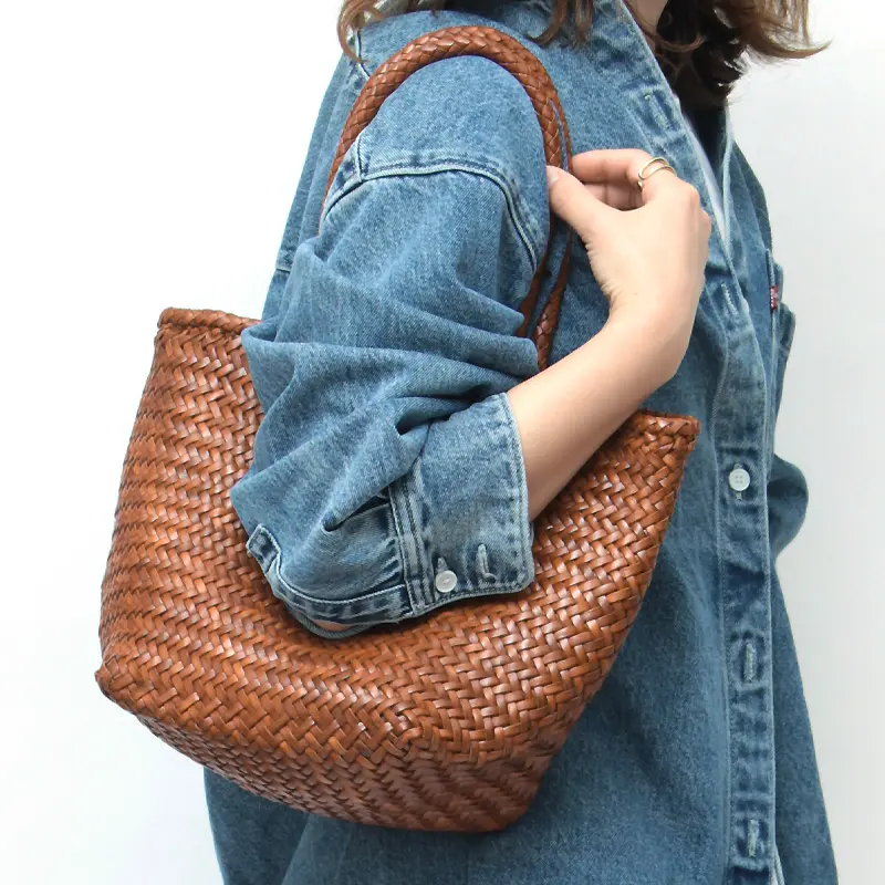 織物とレザーの産地・インドで、熟練の職人が手作業で編み上げたハンドメイドバッグ。牛革を丁寧に編み込んだイントレチャートは、温かみのある表情と滑らかな質感が魅力。使うほどに柔らかく、深みのある色艶へと変化するエイジングも楽しめます。縫い目の少ない仕上げで、衣類に引っかかりにくいのも嬉しいポイント。季節を問わず活躍する、タイムレスな一品です。