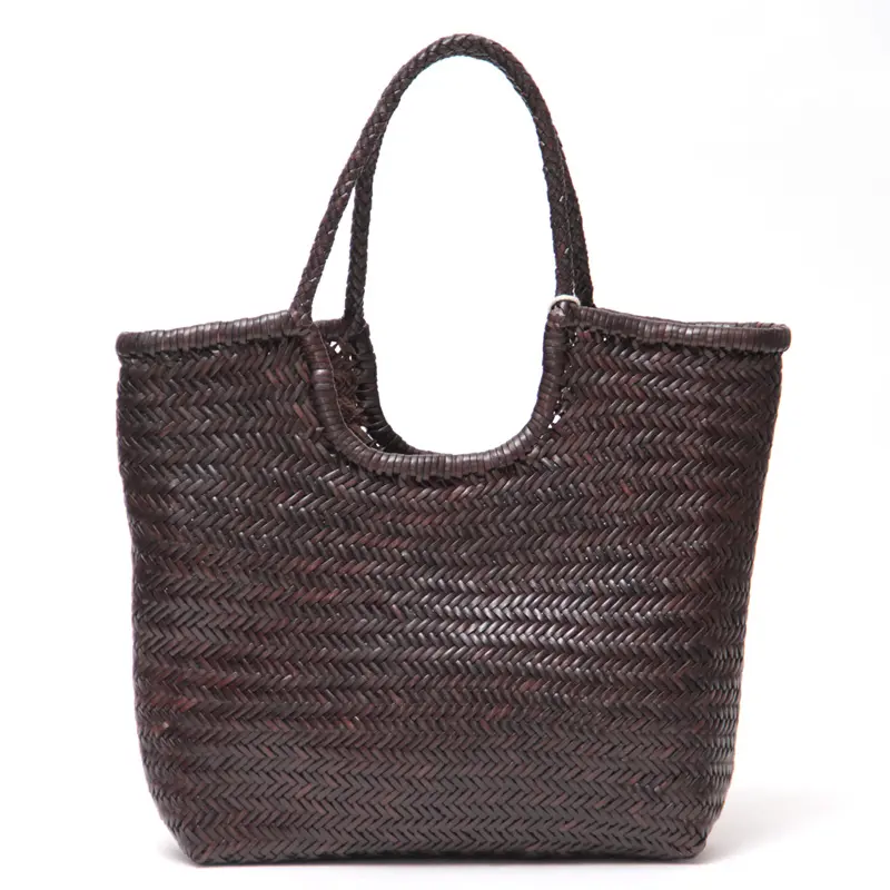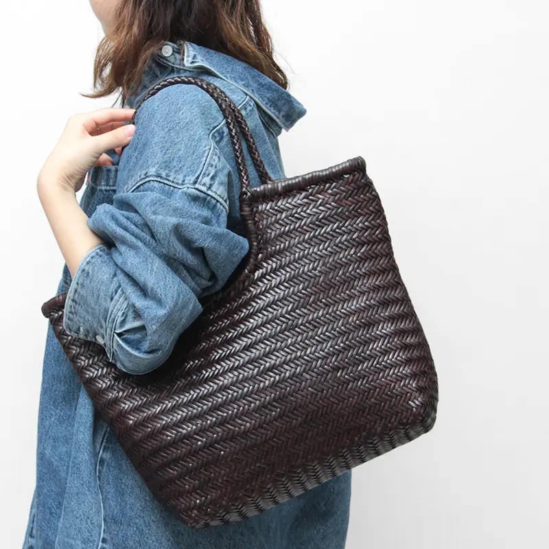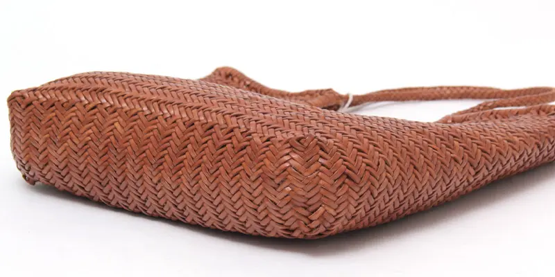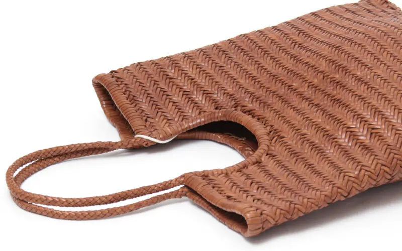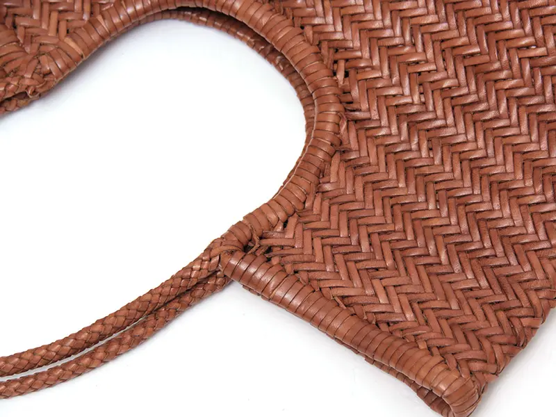 織物とレザーの産地・インドで、熟練の職人が手作業で編み上げたハンドメイドバッグ。牛革を伝統的なバスケット織りで編み込んだイントレチャートは、温かみのある表情と滑らかな質感が魅力。使うほどに柔らかく、深みのある色艶へと変化するエイジングも楽しめます。縫い目の少ない仕上げで、衣類に引っかかりにくいのも嬉しいポイント。季節を問わず活躍する、タイムレスな一品です。