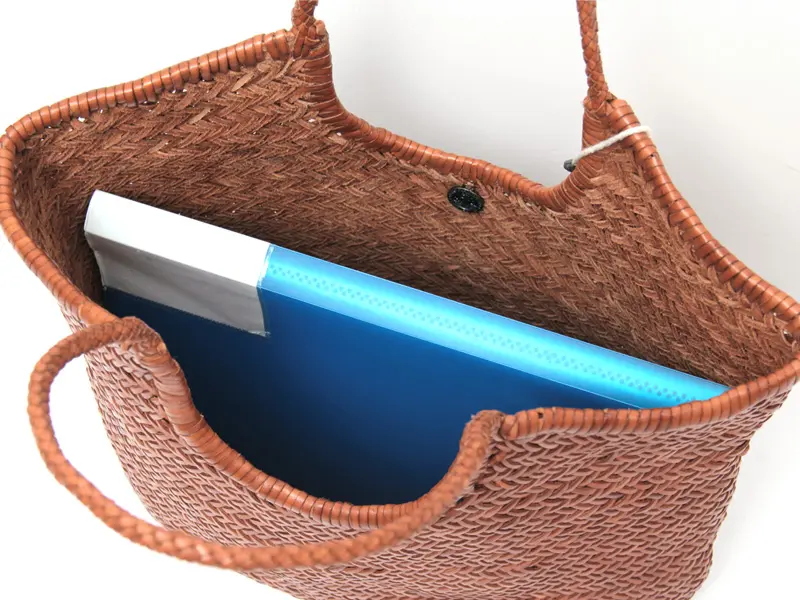 A4ファイルやノートパソコン、お弁当箱まで収納可能。薄マチでも荷物に合わせて自然に膨らみ、見た目以上の収納力を発揮します。ハンドルからサイド、底面までをすべてレザー紐で丁寧に編み上げたフォルムは、まるで一つのアートピースのよう。裏地のない軽やかなつくりで、本革ながら驚くほど軽量。バンダナやスカーフを添えれば、おしゃれに目隠しでき、防犯面も安心です。
