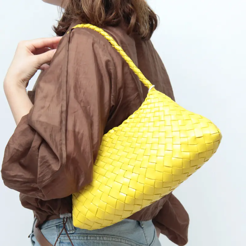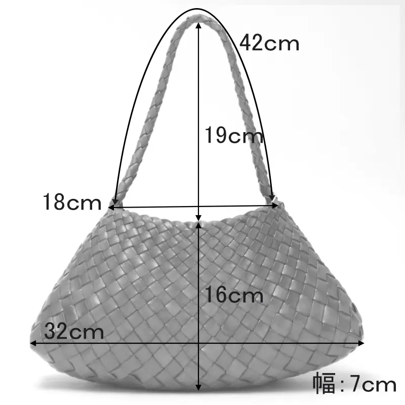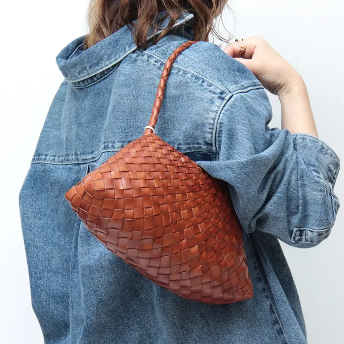 丁寧に編み込まれた華奢なハンドルは手に馴染みやすく、ハンド持ちにちょうどいい長さ。やや長めの設計なので、薄手の装いであれば肩掛けも可能です。