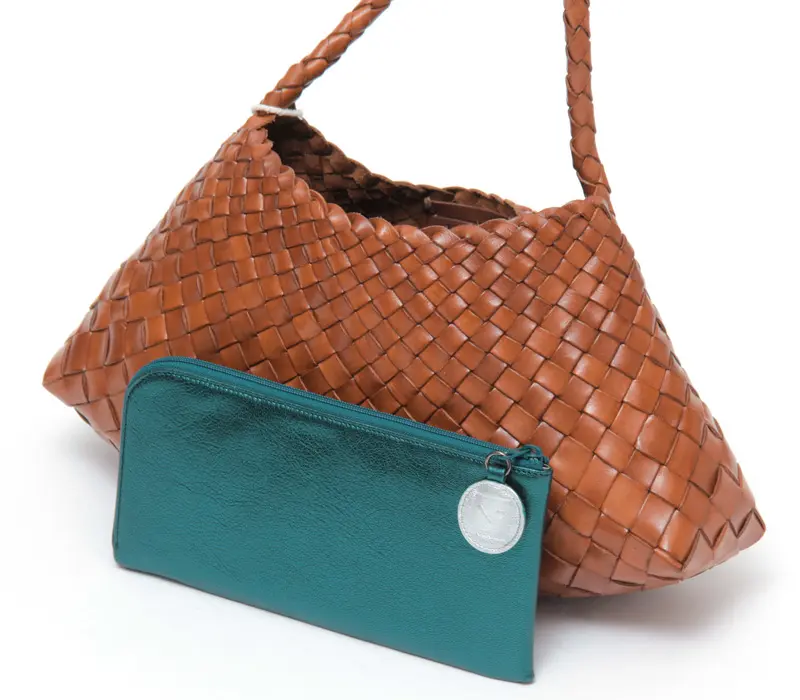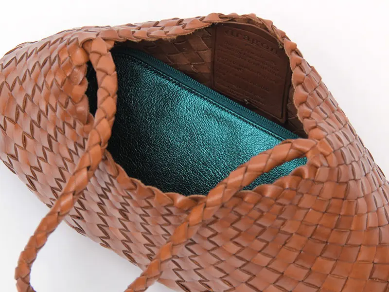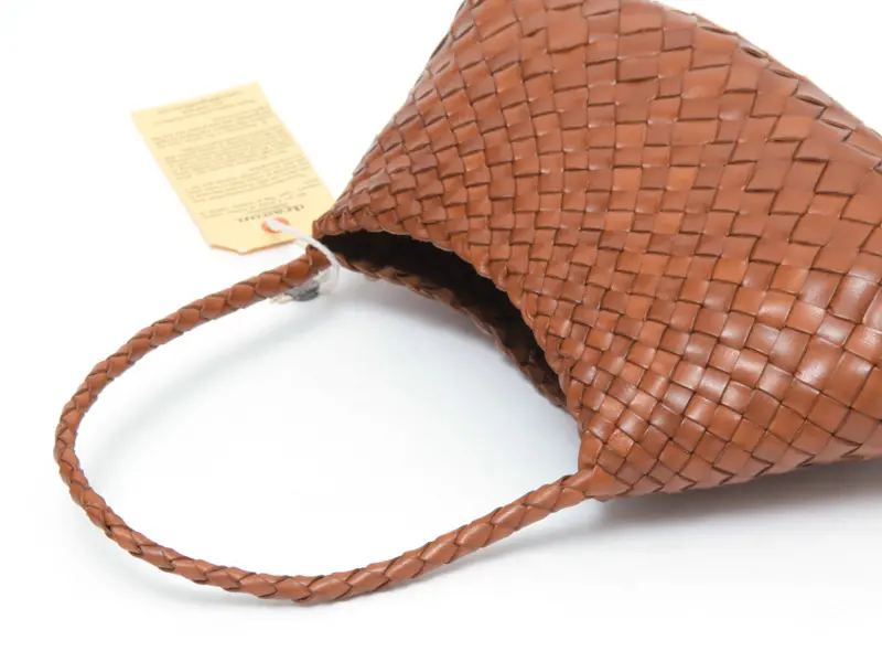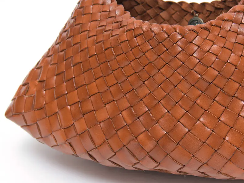 織物とレザーの産地・インドで、熟練の職人が手作業で編み上げたハンドメイドバッグ。牛革をつばに向かって繊細に細くなる不規則な革編みのイントレチャートは、温かみのある表情と滑らかな質感が魅力。使うほどに柔らかく、深みのある色艶へと変化するエイジングも楽しめます。縫い目の少ない仕上げで、衣類に引っかかりにくいのも嬉しいポイント。季節を問わず活躍する、タイムレスな一品です。