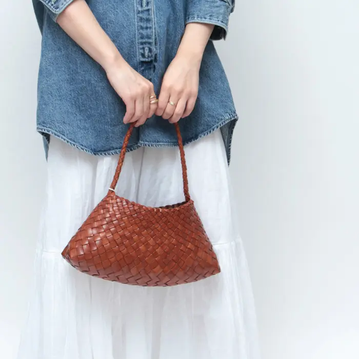 つばに向かって繊細に細くなる不規則な革編みのストラップが特徴の「Rosanna」は、ブランドのベストセラーモデル「Santa Croce」を彷彿とさせるデザイン。春夏は涼しげに、秋冬は抜け感のあるレザーバッグとして、シーズンレスに活躍します。カジュアルからフェミニンまで幅広いスタイルにマッチし、毎日の装いに上品なアクセントを添えてくれる存在です。