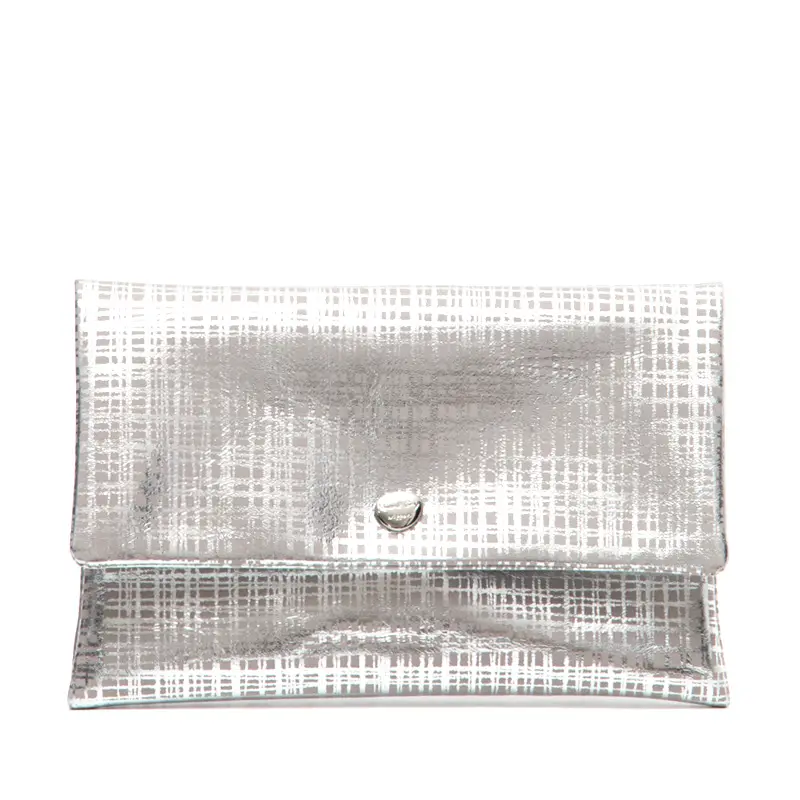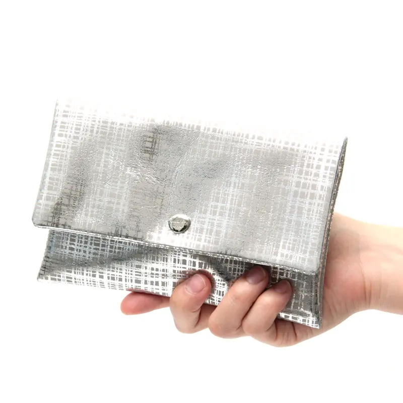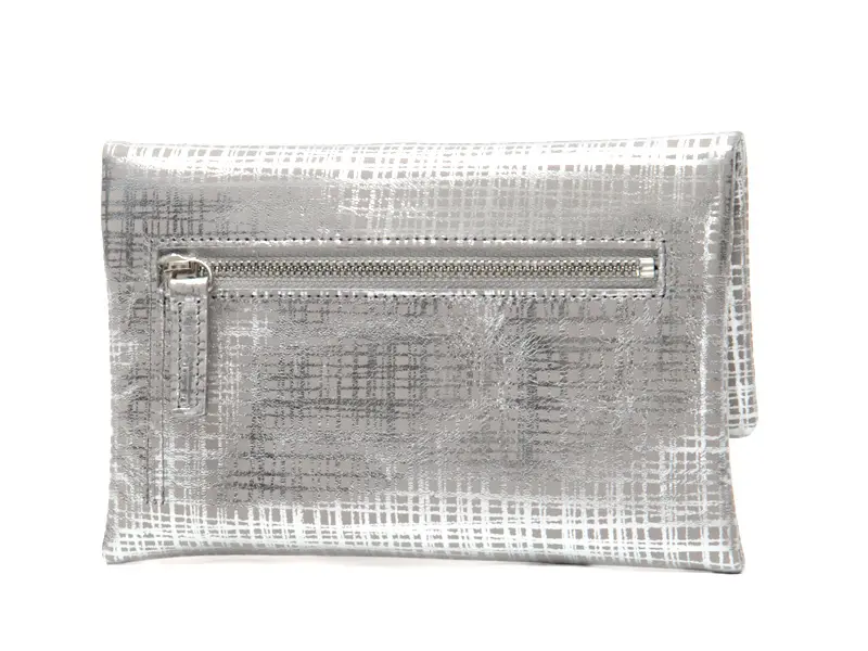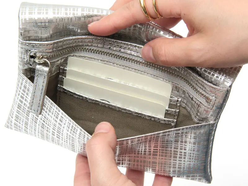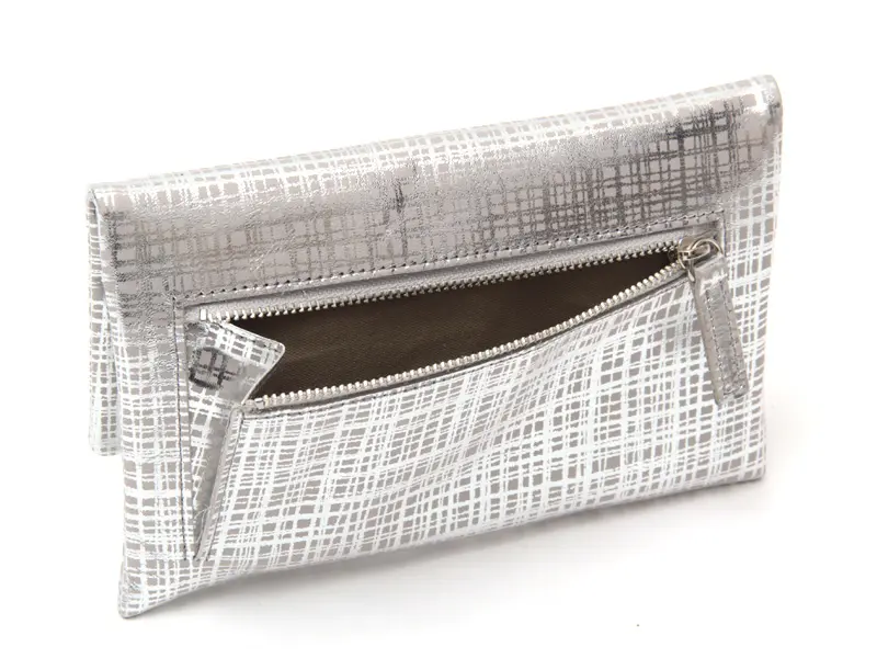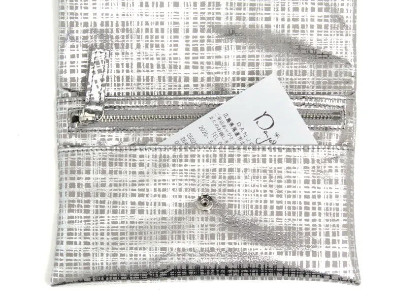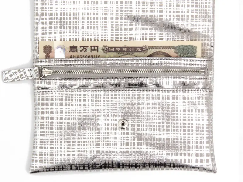 牛革にネットチェック柄の箔プリントを施したオリジナル素材を使用。手元華やぎ、お会計の度に気分も上がりそう。表に縫い目を出さない仕様も新鮮なお財布です。