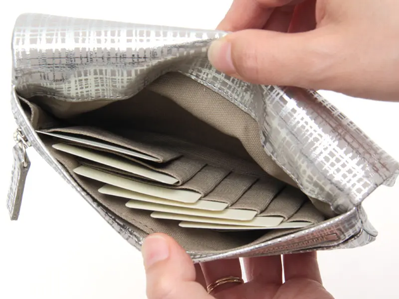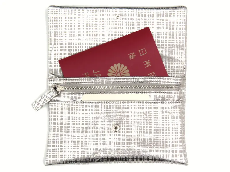 内側のファスナーポケットは、絆創膏やお薬、アクセサリーなどの一時的な収納に便利で、多用途にお使いいただけます。使用頻度の低いカードやお守りの保管にもぴったりな収納スペースです。通常の長財布に比べ奥行きがあり、通帳やパスポートもきれいに収まります。