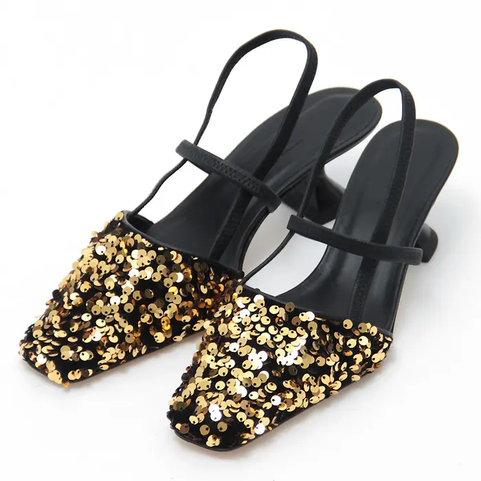 つま先はスクエアトゥで、トレンド感のあるデザイン。アッパー部分はベロア地にゴールドのスパンコールが散りばめられており、大人スタイルにぴったりのエレガントな雰囲気を演出します。