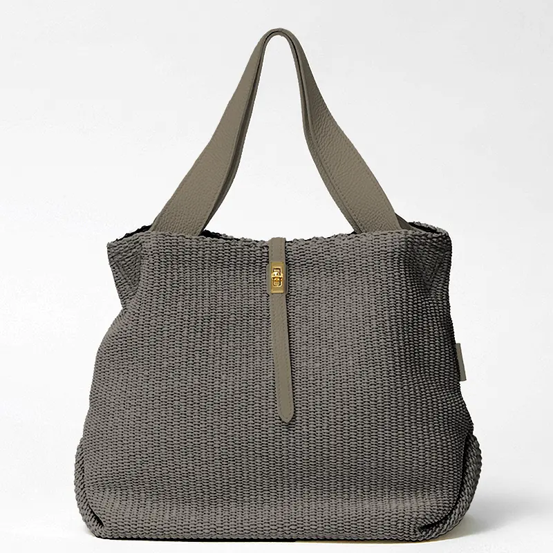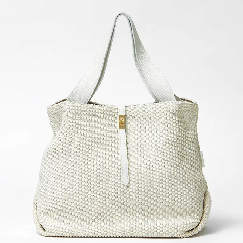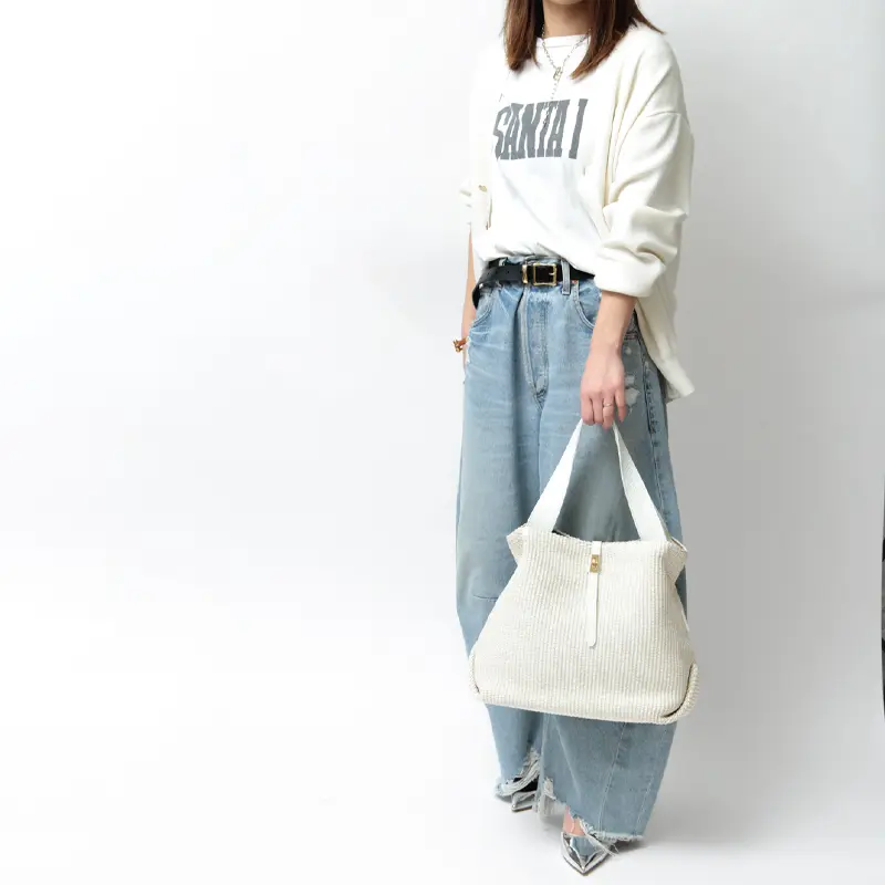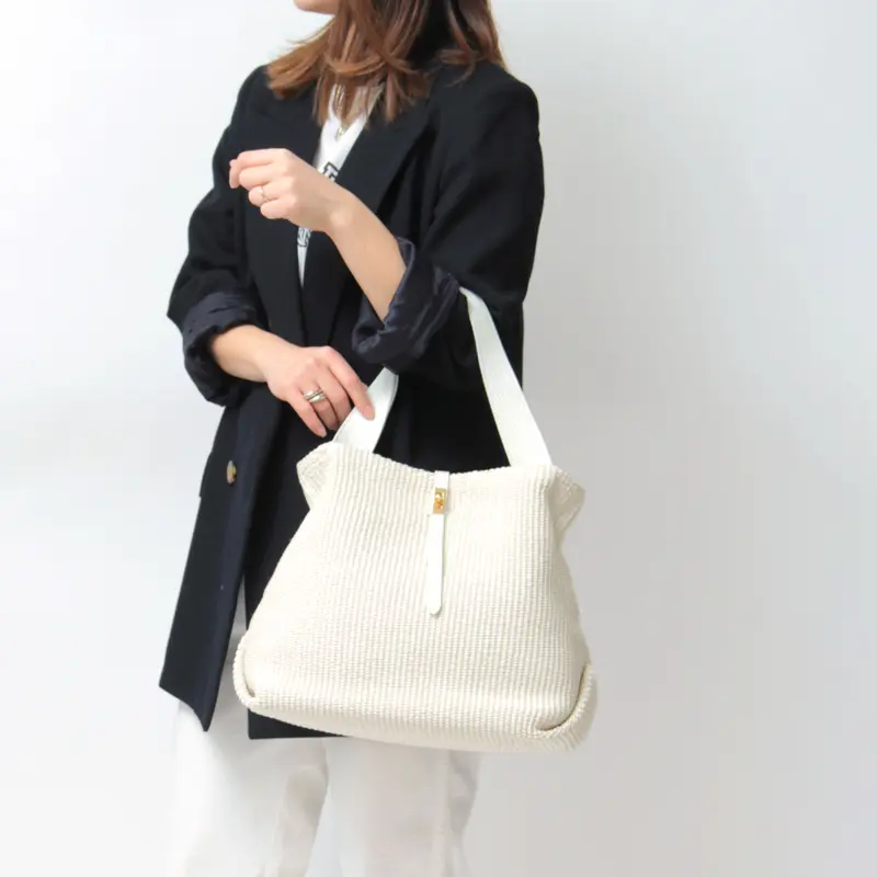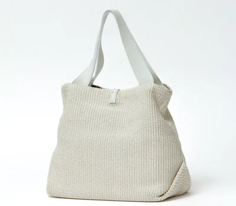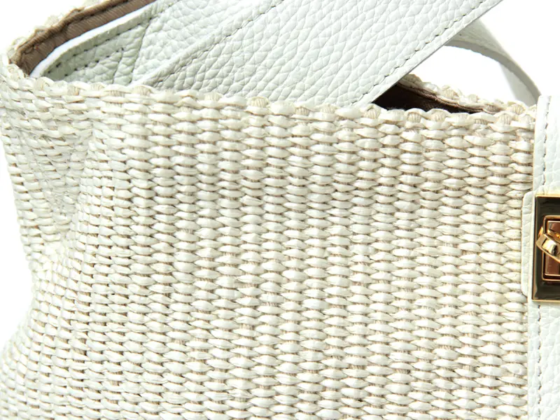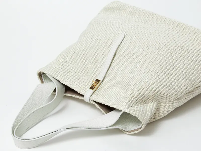 本体素材はコットンとポリアミドでできたイタリア製のラフィア調シートです。従来の手編みのかごバッグでは表現しづらいトレンド感のあるクリーンなデザインで、引っ掛かりのない滑らかな肌触りが特徴です。また天然素材に比べ、劣化しにくく、多少の雨でも安心してお持ちいただけます。