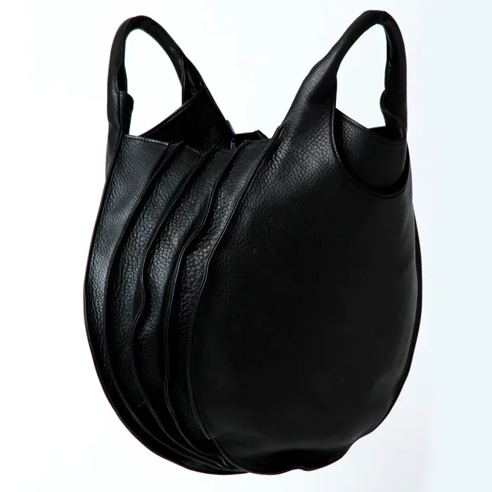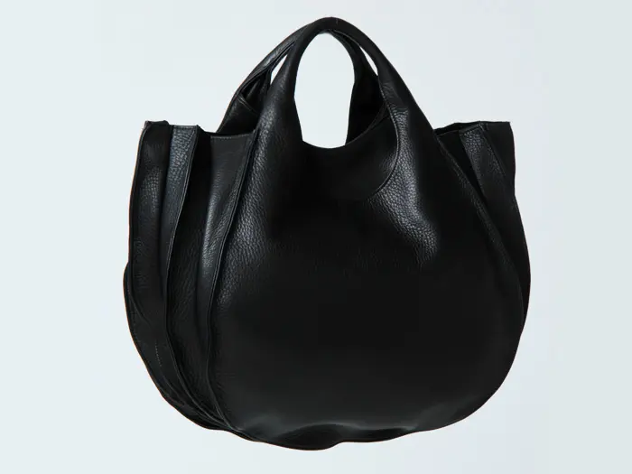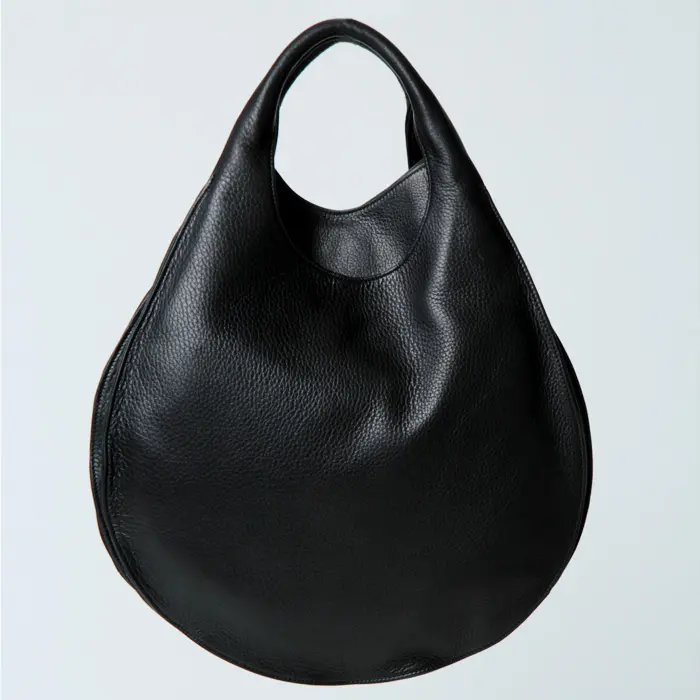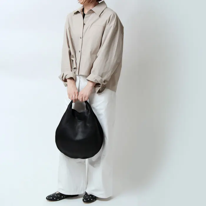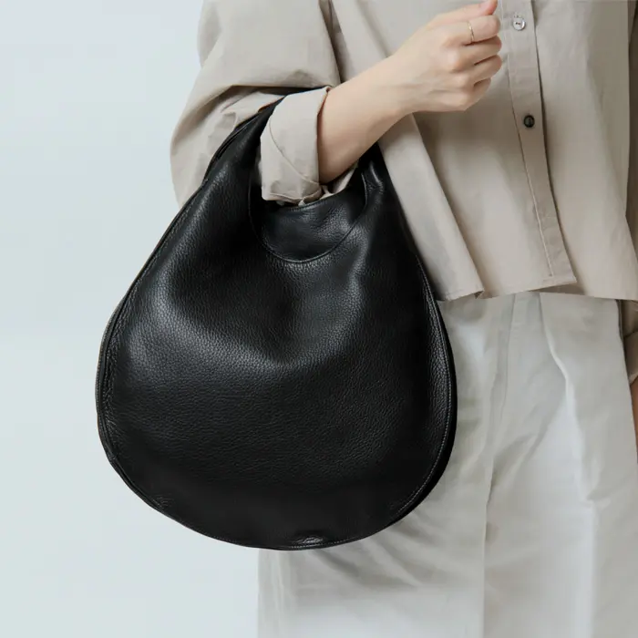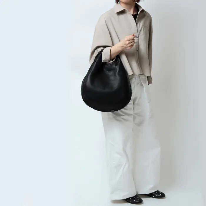バッグ本体から続くアーチのラインは仕立ての美しさが際立ち、ほどよい太さのあるハンドルは持ちやすく手に馴染みます。ハンドで持っても腕に掛けてもバランスよく持てるサイズ感です。