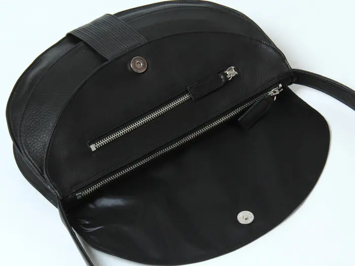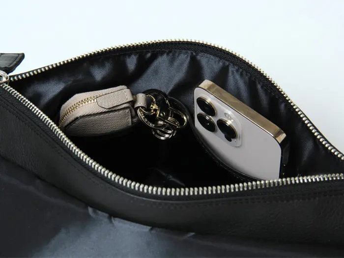 メイン収納の開閉はファスナー仕様。長財布やポーチなどお出かけの必需品が収納できます。正面内側にオープンポケット2つ、背面内側にファスナーポケット1つあり、鍵やスマホ、リップなどの小物もスッキリと収納できます。