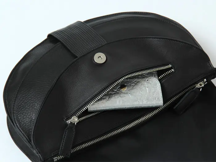 開閉はマグネット付きのフラップ仕様。フラップ下にファスナーポケットが付いています。