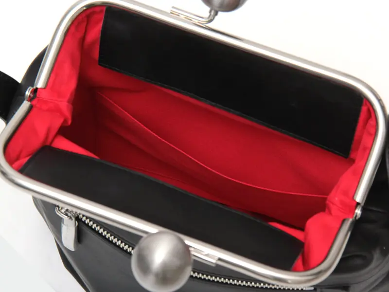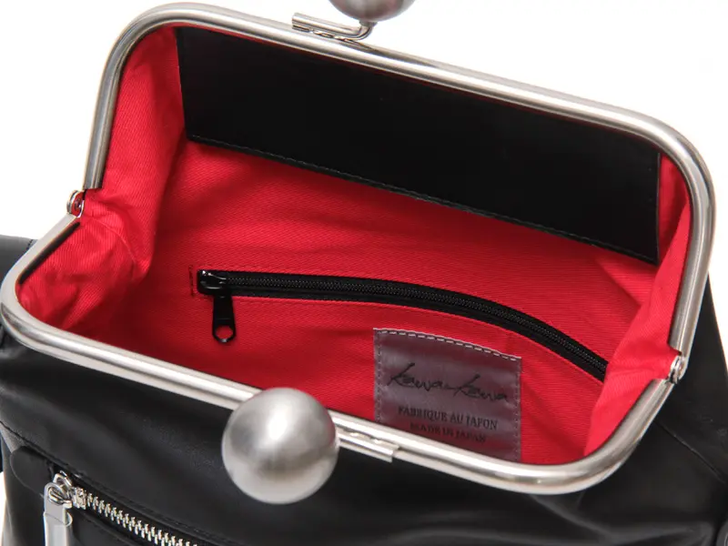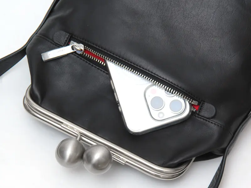 開閉はパチンとしっかり留まる口金仕様で、防犯対策としても頼れる設計です。長財布やお出かけの必需品に加え、500mlのペットボトルなども収納できます。 内側にはファスナーポケットとオープンポケット各1つがあり、鍵やスマホ、イヤホンなどの小物もスッキリと収納できます。