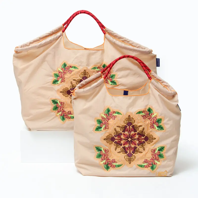 グラフィックデザインをそのまま刺繍で施すことで高級感がありデザイン性の高い仕上がりに。見た目だけでなく耐久性、撥水性に優れた厚手の素材を使用しているので、重い荷物の持ち運びも安心です。折りたたむと、手のひらほどのサイズになるのでコンパクトにしまえ、買い物への活用はもちろん、常に携帯しておけば外出中に急に荷物が増えた時などに対応でき、非常に便利なエコバッグです。エコなプレゼントとしても人気のアイテムです。