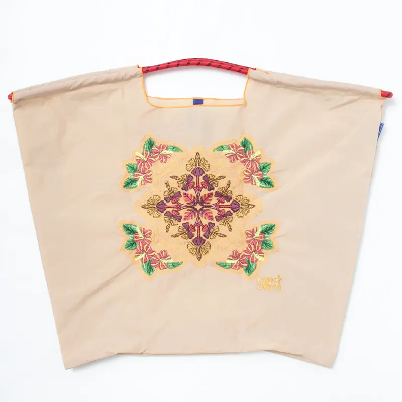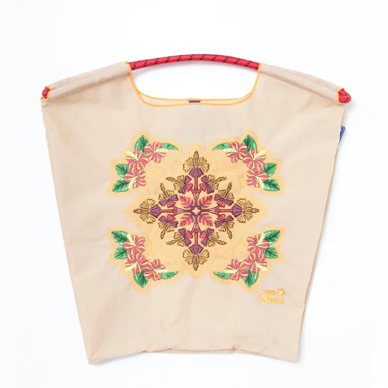グラフィックデザインをそのまま刺繍で施すことで高級感がありデザイン性の高い仕上がりに。見た目だけでなく耐久性、撥水性に優れた厚手の素材を使用しているので、重い荷物の持ち運びも安心です。折りたたむと、手のひらほどのサイズになるのでコンパクトにしまえ、買い物への活用はもちろん、常に携帯しておけば外出中に急に荷物が増えた時などに対応でき、非常に便利なエコバッグです。エコなプレゼントとしても人気のアイテムです。