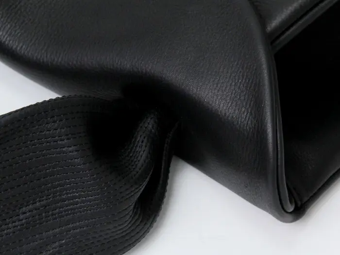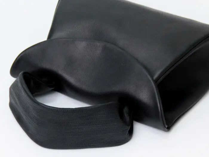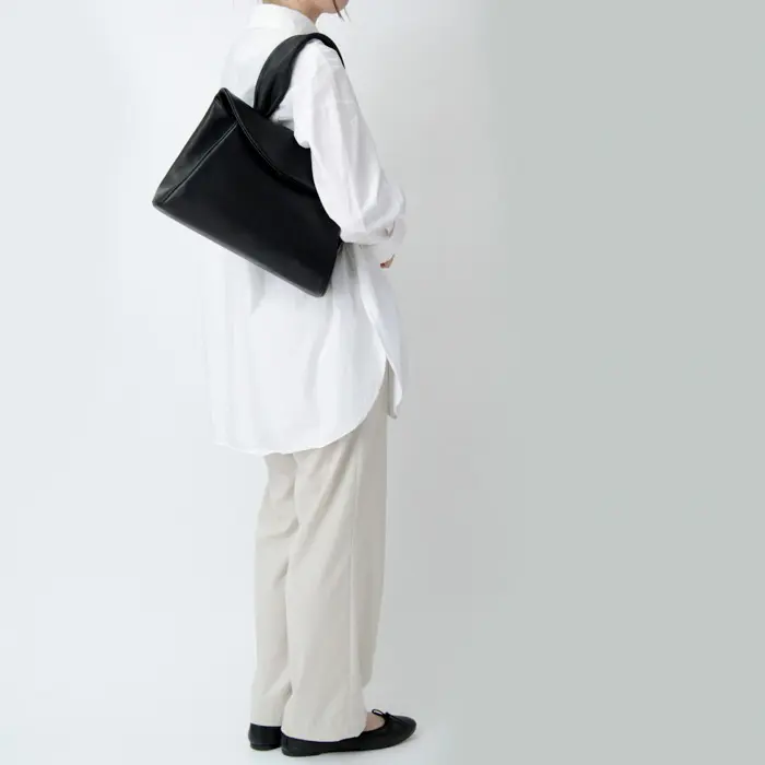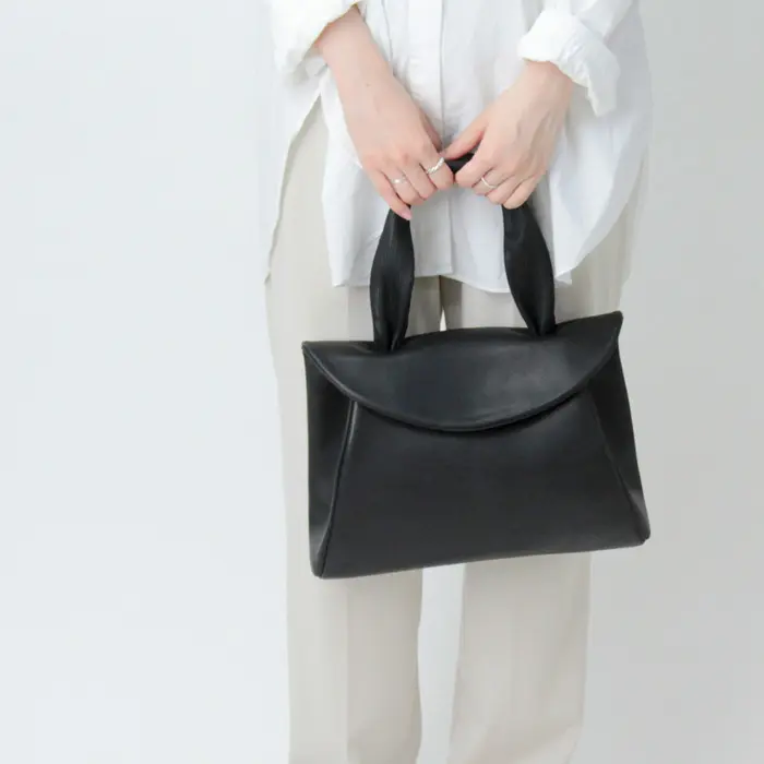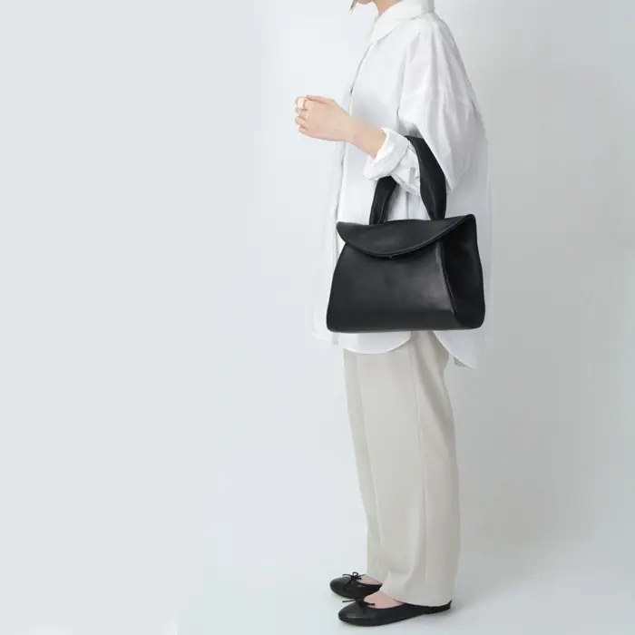 細かいステッチが特徴的なキップソフトレザーのハンドルは幅もあり持ちやすく手に馴染みます。ハンドで持っても腕に掛けてもバランスよく持てるサイズ感です。薄手のお洋服だと肩掛けも可能です。