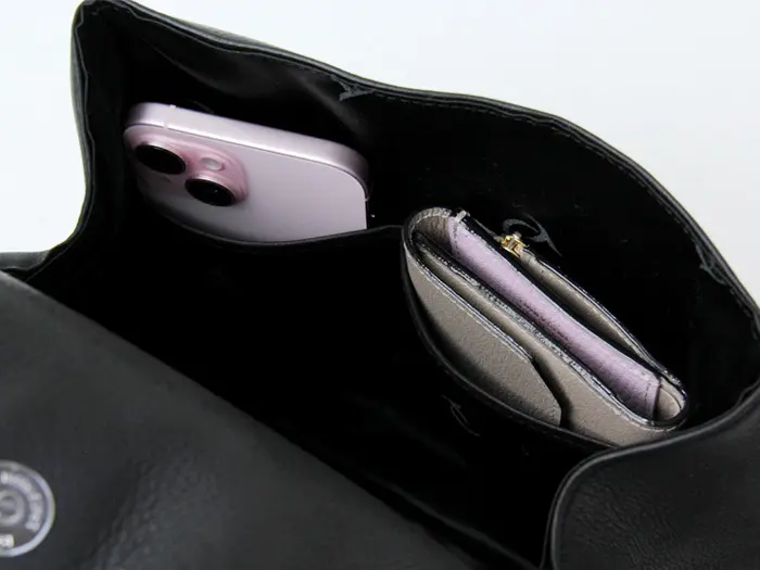 お出かけの必需品に加えペットボトルやA5サイズの手帳なども収まり、見た目以上の収納力です。 便利なオープンポケットと鍵などの貴重品をしまっておくのに安心なファスナーポケットも付いています。