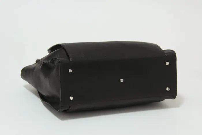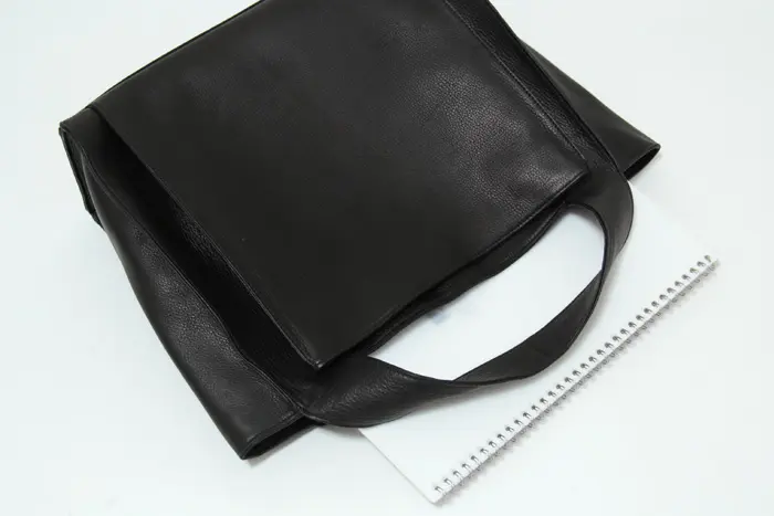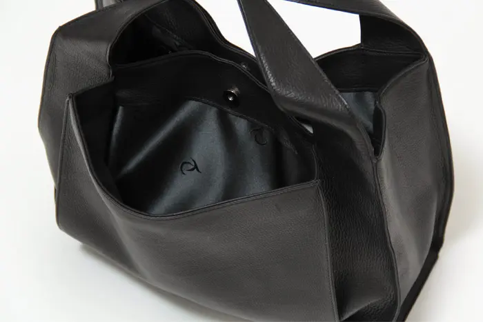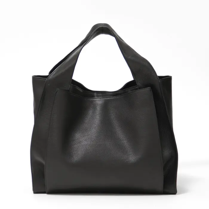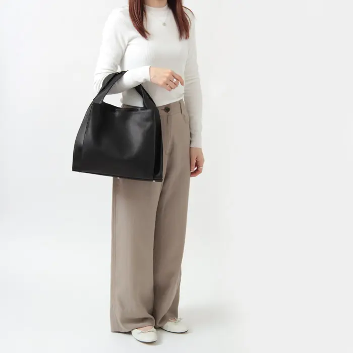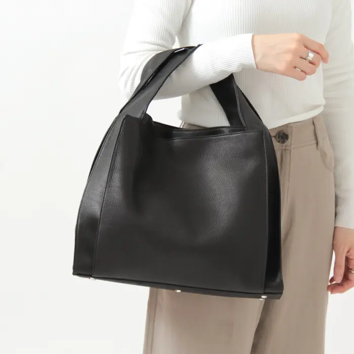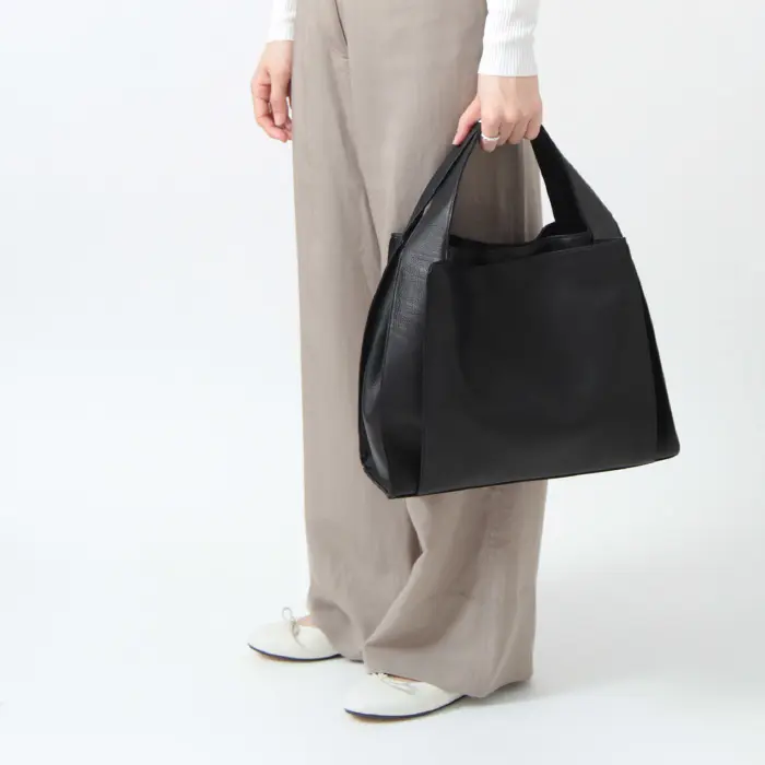 ソフトな黒レザーが上質感漂う"michiamo ミキアモ"のトートバッグ。かっちりしすぎない四角いシルエットがこなれて見え、フォーマルな装いにもマッチします。A4サイズ対応で荷物がしっかり収まり、普段や通勤にはもちろん、学校行事や冠婚葬祭など幅広いシーンでお使いいただけます。