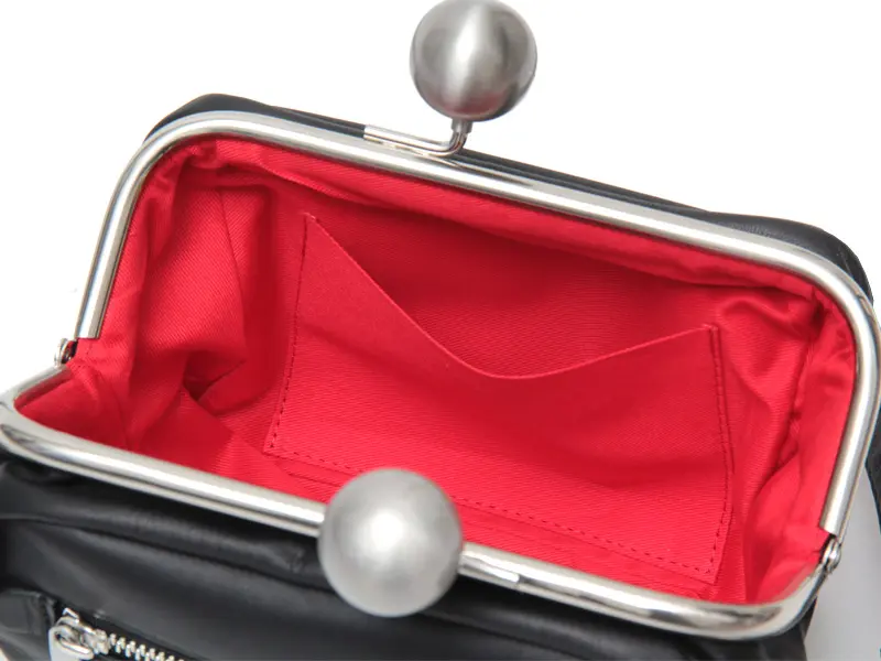 開閉はパチンとしっかり留まる口金仕様で、防犯対策としても頼れる設計です。ミニ財布やスマホなど必要最低限の荷物が収納できます。 内側にはファスナーポケットとオープンポケット各1つがあり、鍵などの小物もスッキリと収納できます。