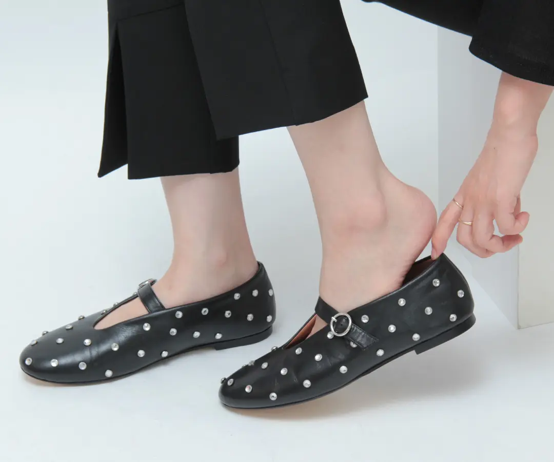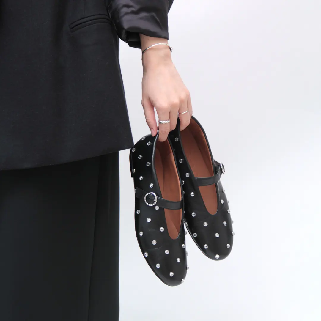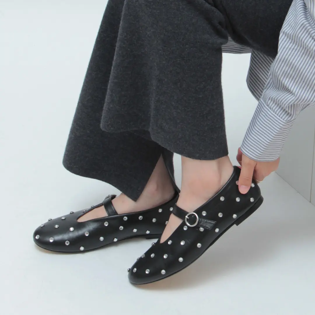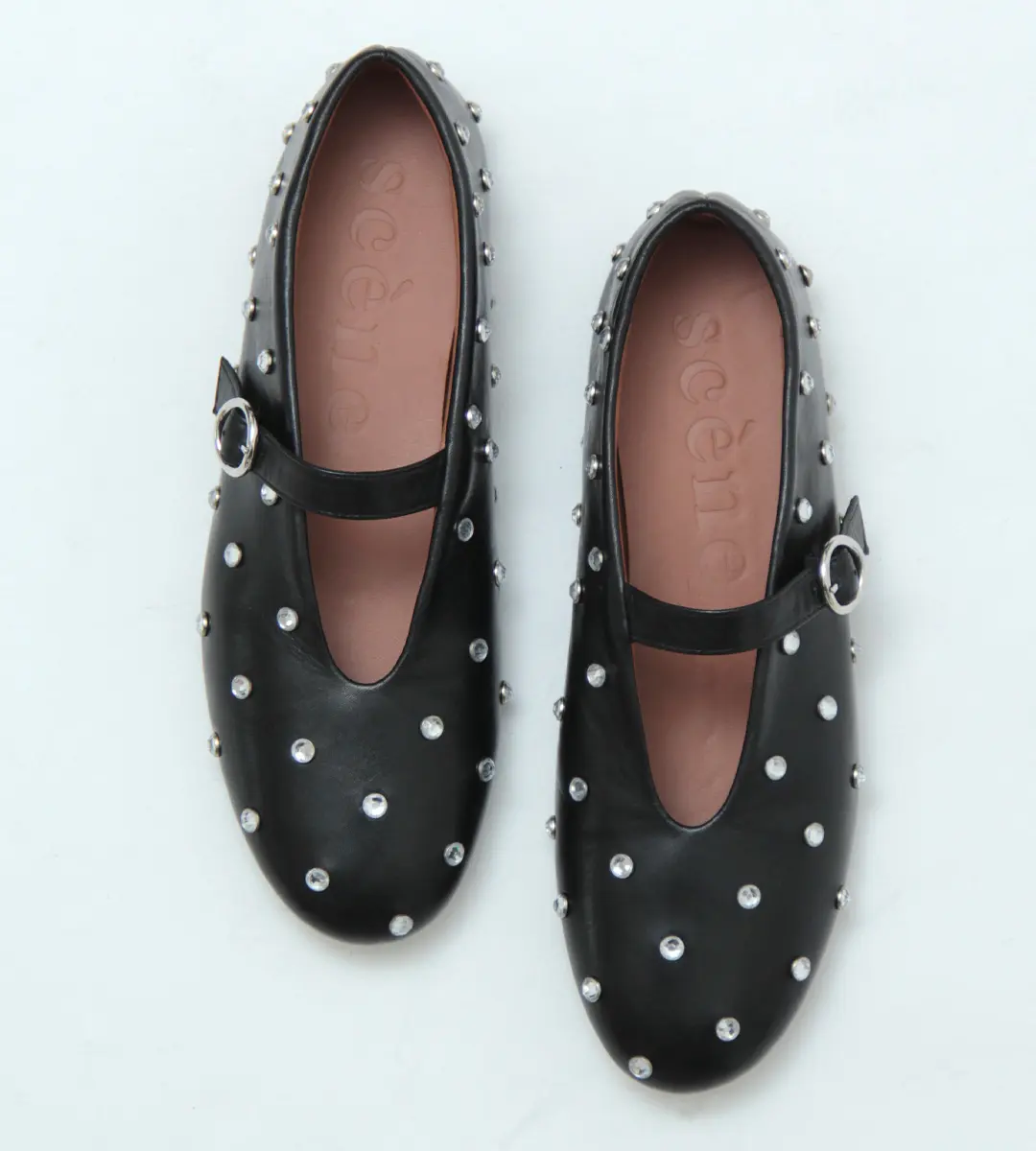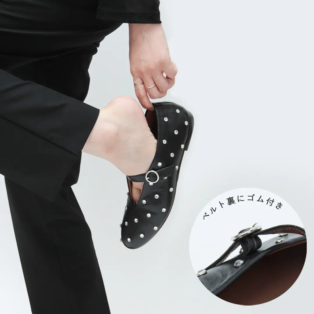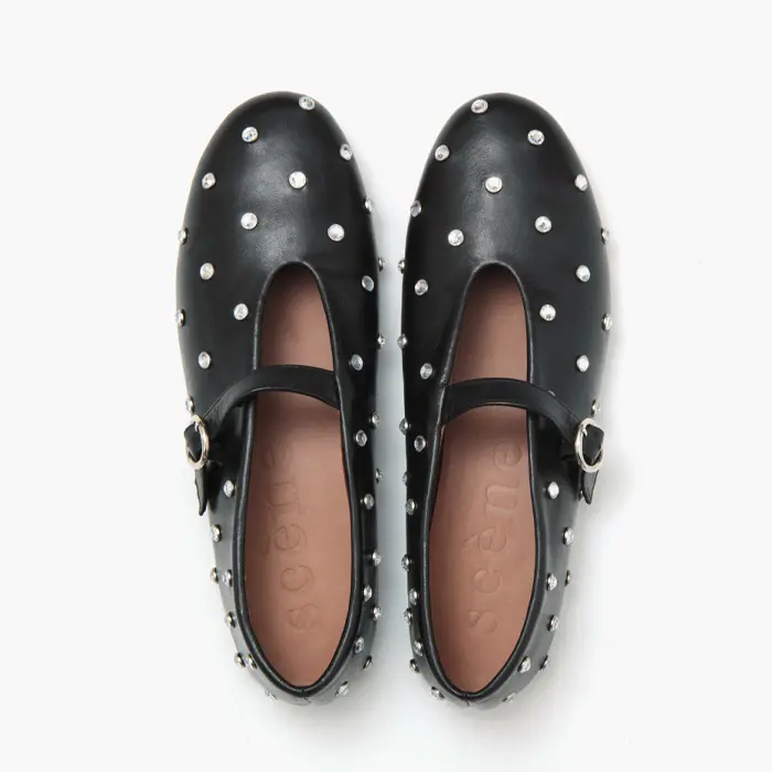 小さなスタッズが並ぶ"scene シェーン"のLUZ(ラズ)シリーズのメリージェーン。エッジの効いたスタッズとエレガントなクリスタルが織りなす絶妙な甘辛バランス。