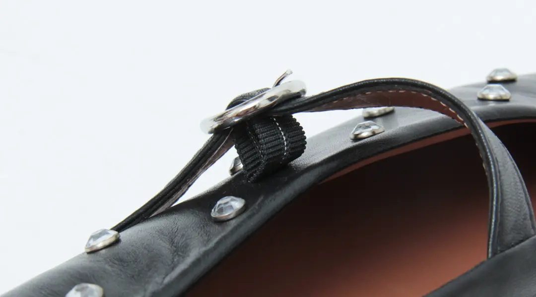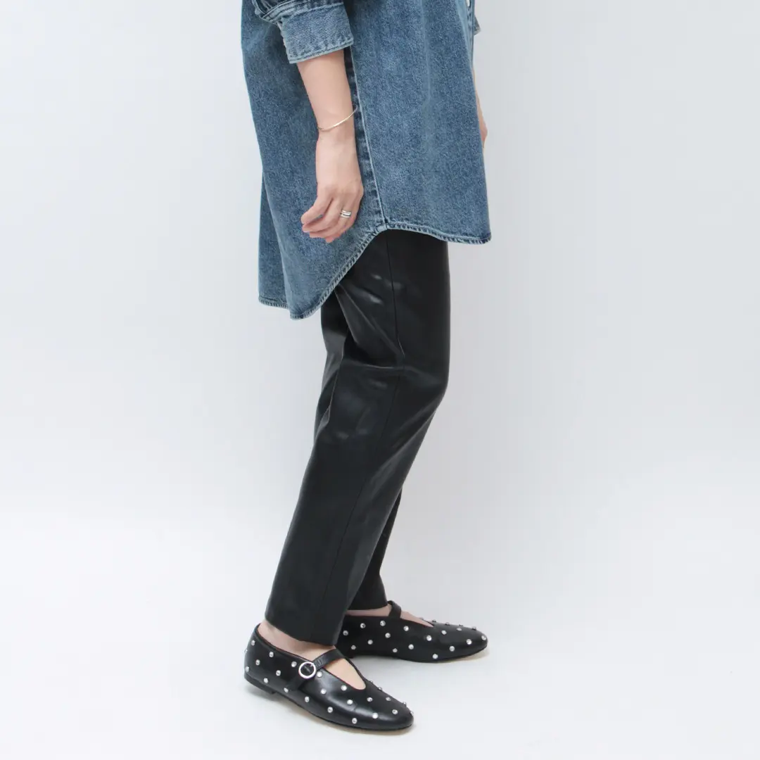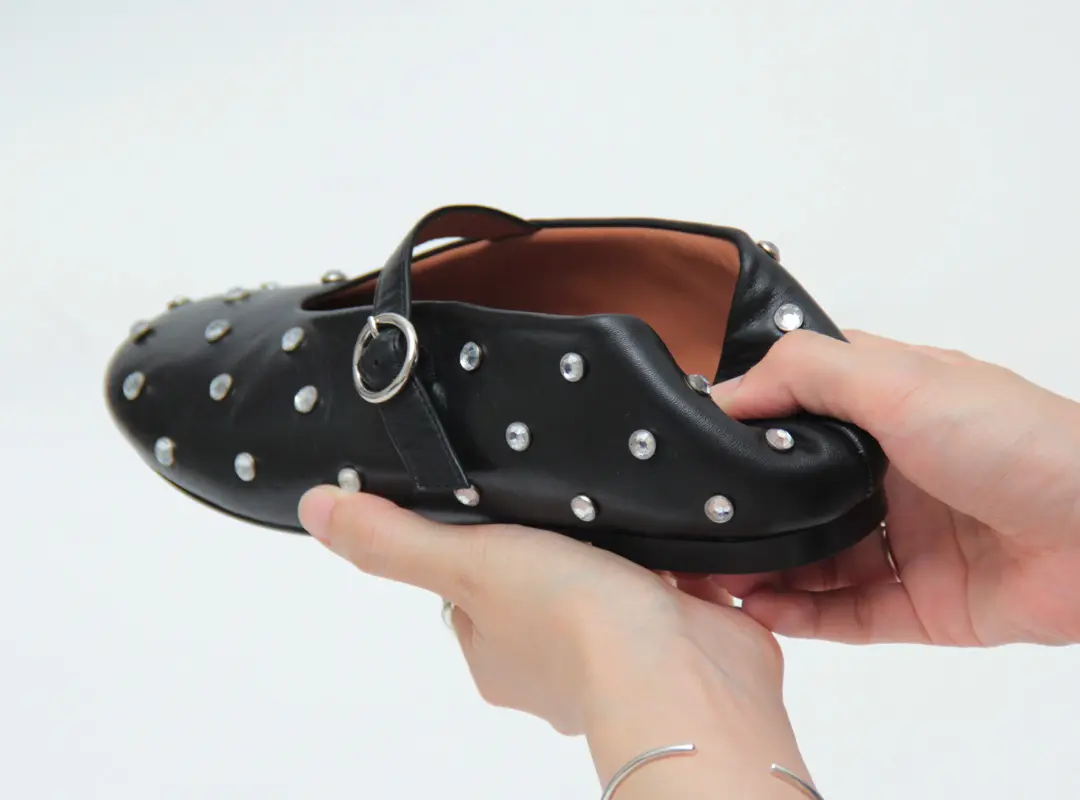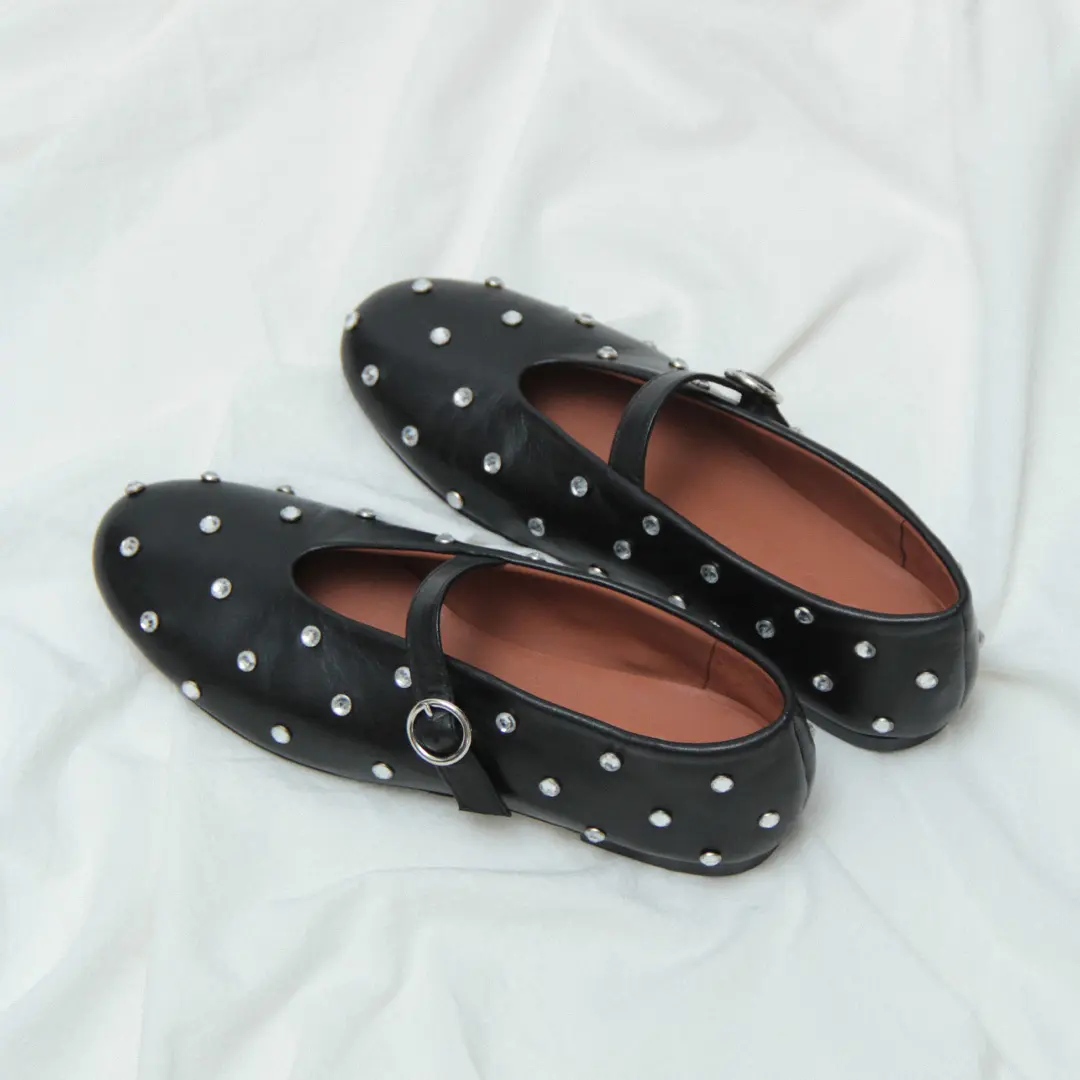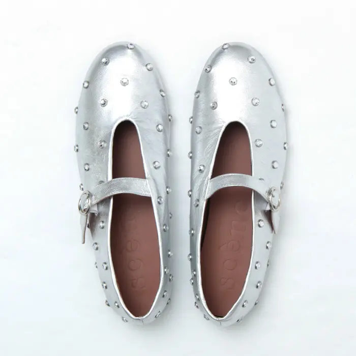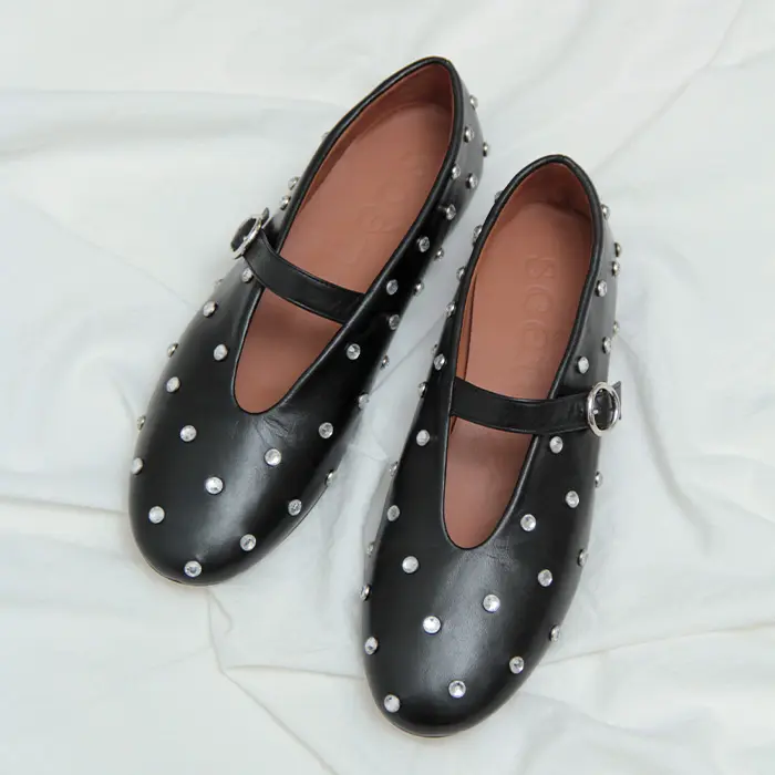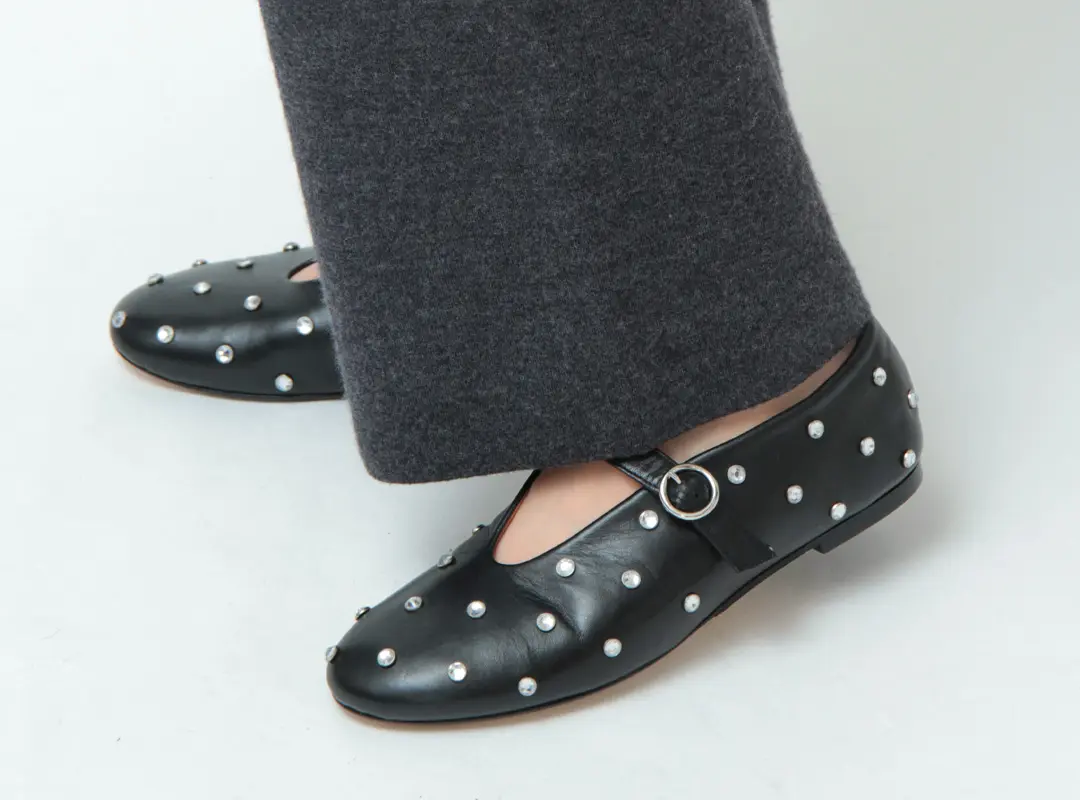 小さなスタッズが並ぶ"scene シェーン"のLUZ(ラズ)シリーズのメリージェーン。エッジの効いたスタッズとエレガントなクリスタルが織りなす絶妙な甘辛バランス。
