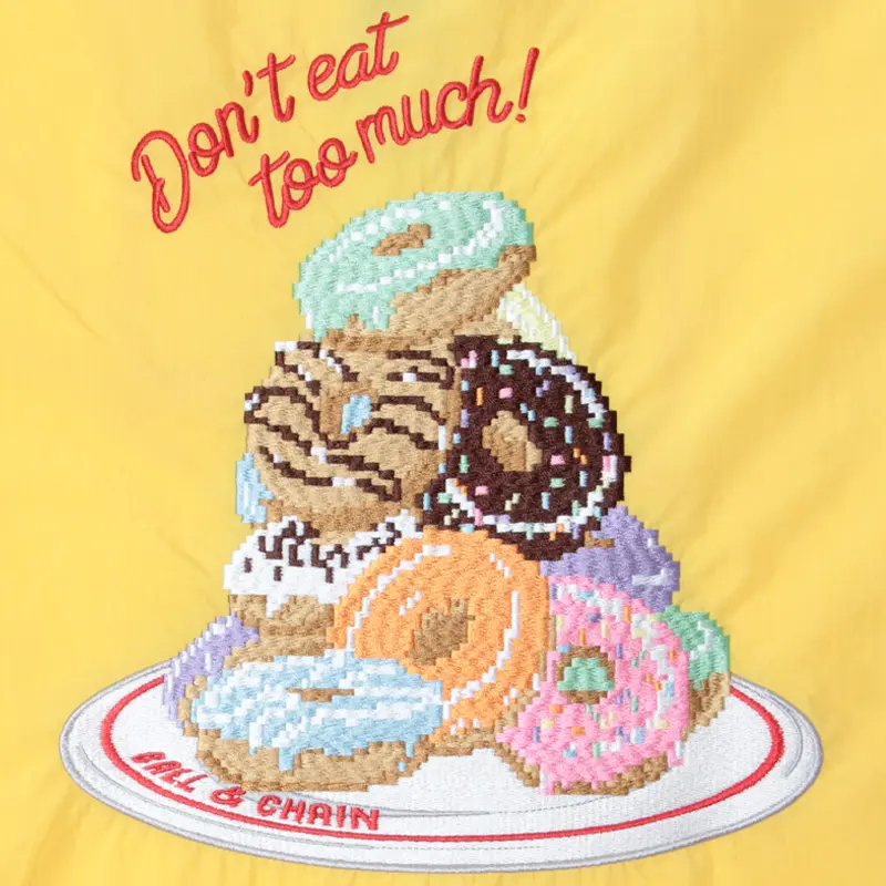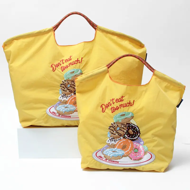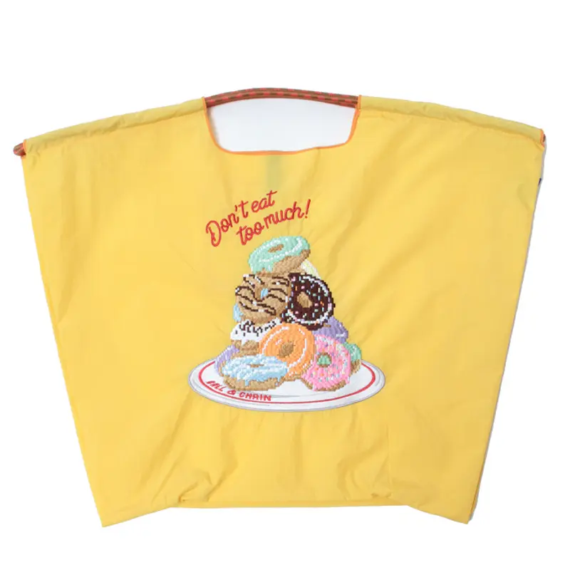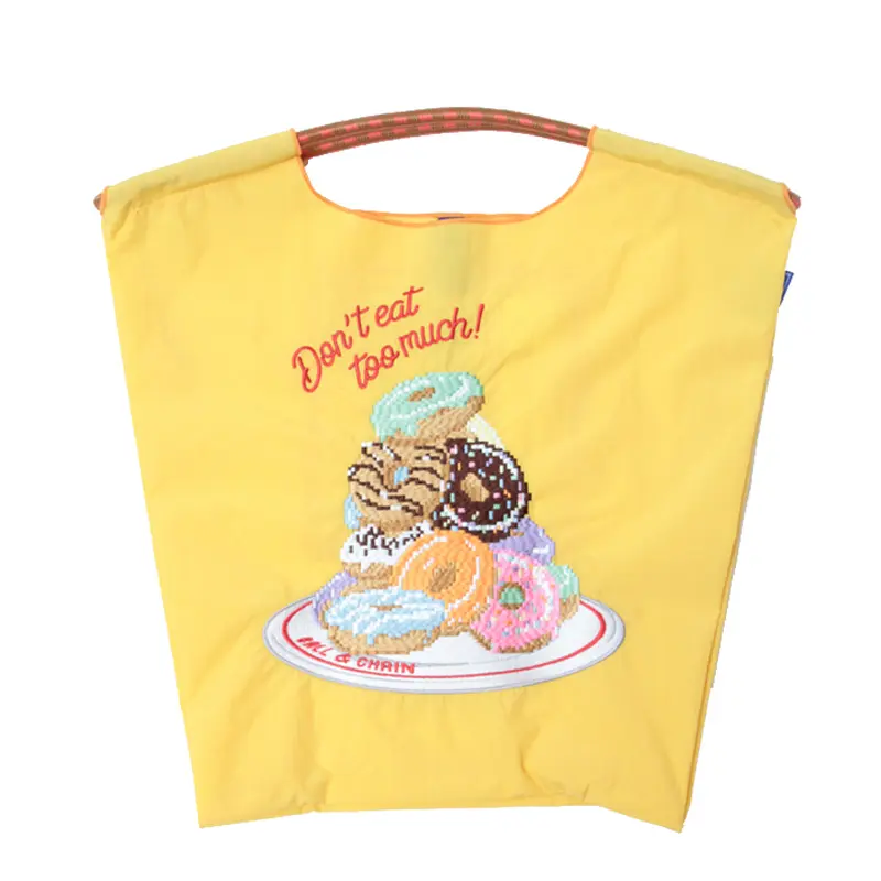 イエローのナイロンバッグは、ポップなドットドーナツ柄が映える明るくカラフルなカラーで、持つだけで気分がアップするデザインです。デビュー当時に注目を集めたドーナツデザインを、ピクセル風のグラフィックに落とし込み、遊び心たっぷりのエコバッグに仕上げました。