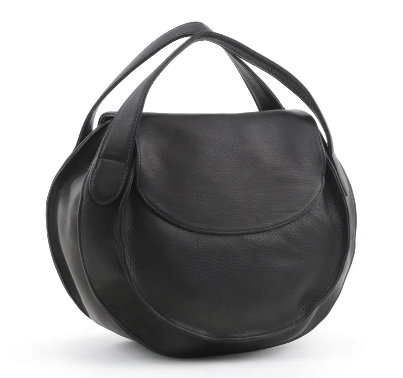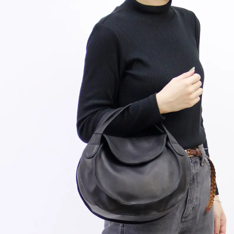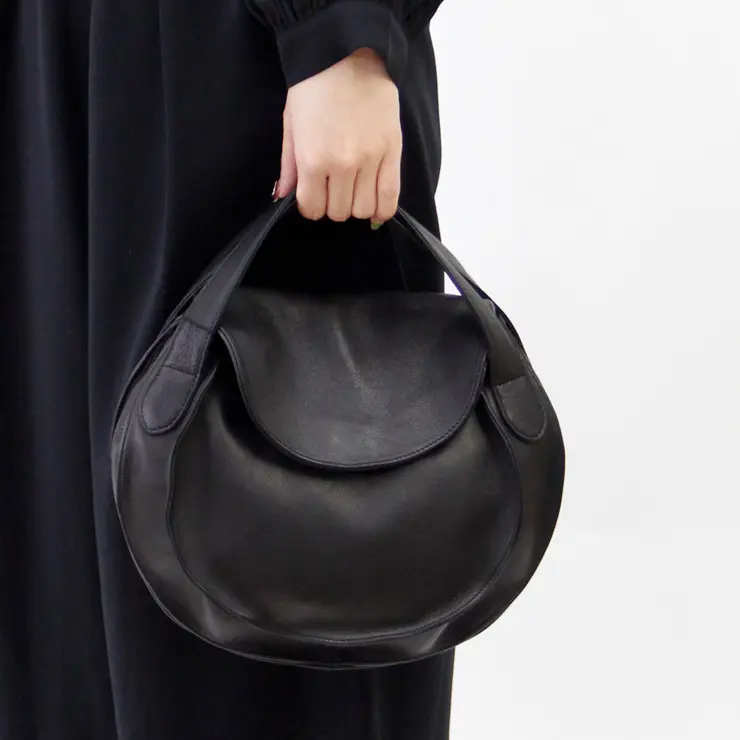 女性らしい丸みのあるシルエットが魅力の半月型ハンドバッグ。無駄を省いたシンプルなデザインながら、広めのマチで収納力も抜群。毎日のコーデに寄り添う使いやすいサイズ感です。