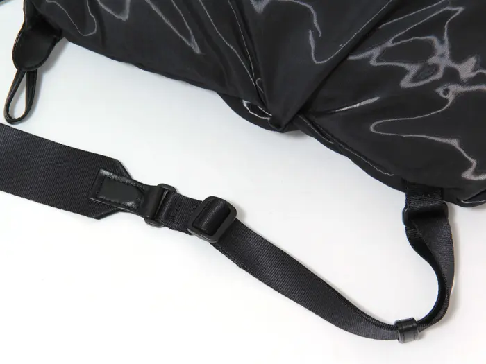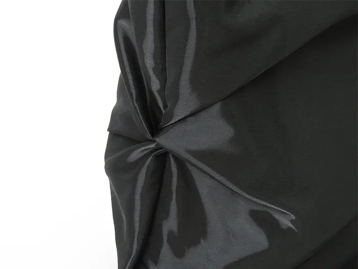細く透明なモノフィラ糸を織り込んだ生地を使用しています。光を受けると変化する光沢感はまるで水面のような美しい輝きです。場所や光の強さで変化する表情をぜひお楽しみください。サイドにドレープを効かせることでふっくらとしたシルエットがさらに光を受けやすく、美しいツヤ感を放ち、コーディネートに品のある華やかさをプラスしてくれます。