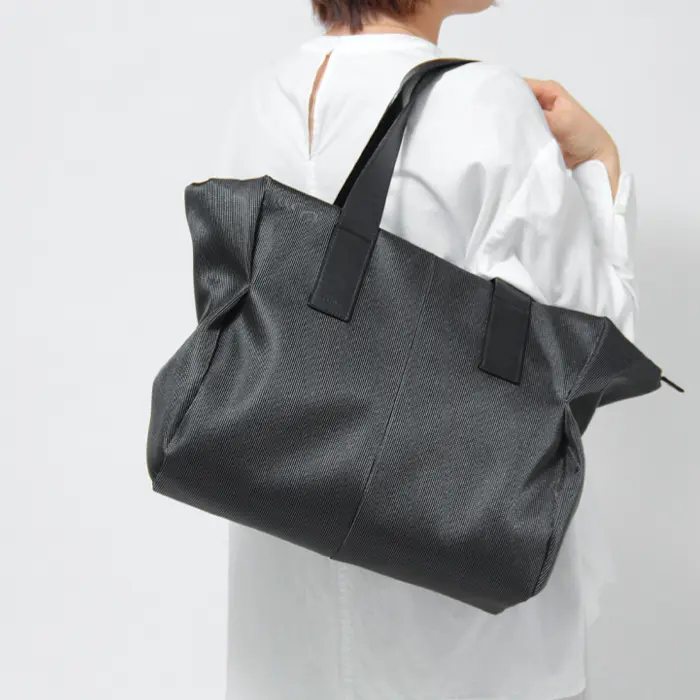 ほどよいシアー感と奥行きのある光沢感が印象的な、ESTINE/エスティーヌの“ゼファー”シリーズ。空気を含ませた特殊な編み方により、軽量ながら強度とハリ感があるしっかりとした素材です。B4サイズ対応のたっぷりとしたサイズ感。カジュアルな装いにはもちろん、スーツスタイルとの相性も良く、幅広いシーンでご使用いただけます。