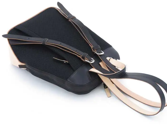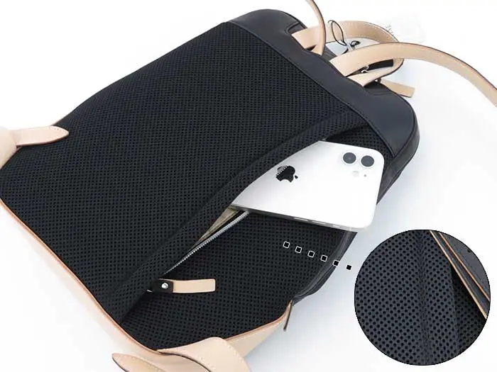 背中に接する部分は通気性の良いメッシュ素材。ファスナーポケットが備わっているので、すぐに取り出したい荷物の収納に便利です。