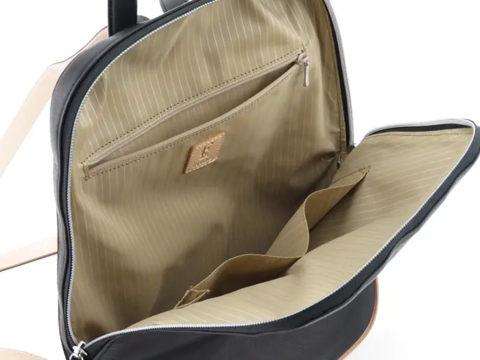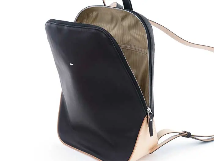 背面内側にファスナーポケットが1つ、正面内側にオープンポケット2つついているので、メモ帳や小物などの収納に便利です。