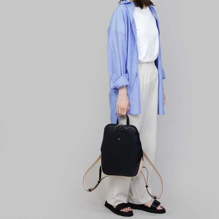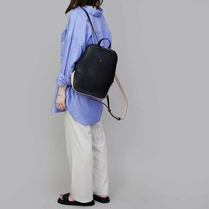シンプルな中にも個性を発揮する"エスティーヌ ESTINE"のリュックサック。白ヌメ革のベージュがあるだけで重たい印象になりすぎず、ほんのりカジュアルダウンしてくれます。長めのショルダー紐で子供っぽくならずお洒落な印象に仕上がります。