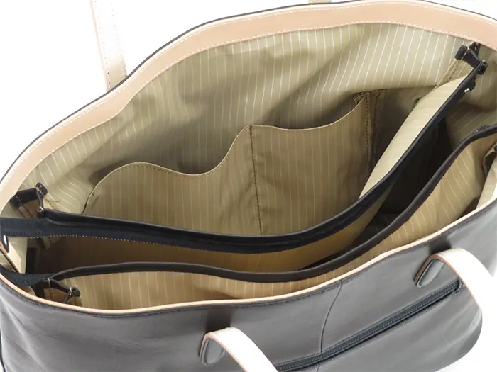 センターにはファスナー付きの収納があり、A4サイズがすっきり収まるサイズ感。ファスナー収納の両サイドには2ヵ所のフリースペースがあるので、荷物を整理して収納が可能です。