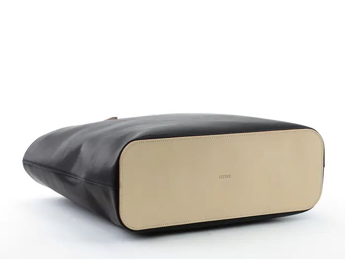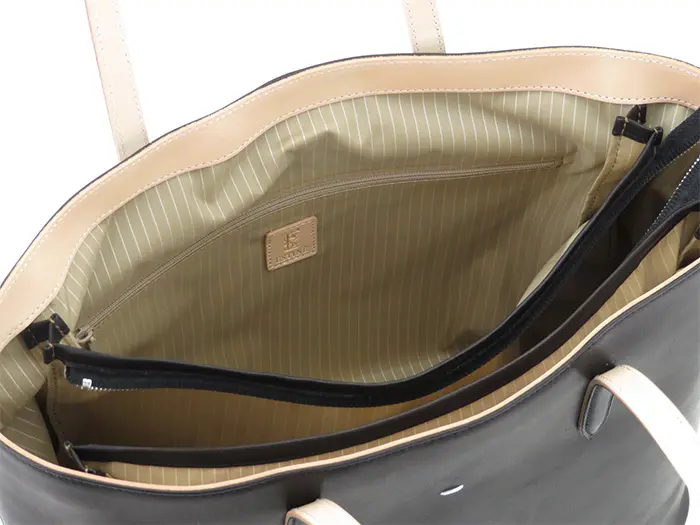 一目で本革と分かるナチュラルな風合いが魅力な"エスティーヌ ESTINE"のトートバッグ。バイカラーのベージュがあるだけで重たい印象になりすぎず、ほんのりカジュアルダウンしてくれます。A4サイズ対応バッグは、オンオフ使える上質バッグです。