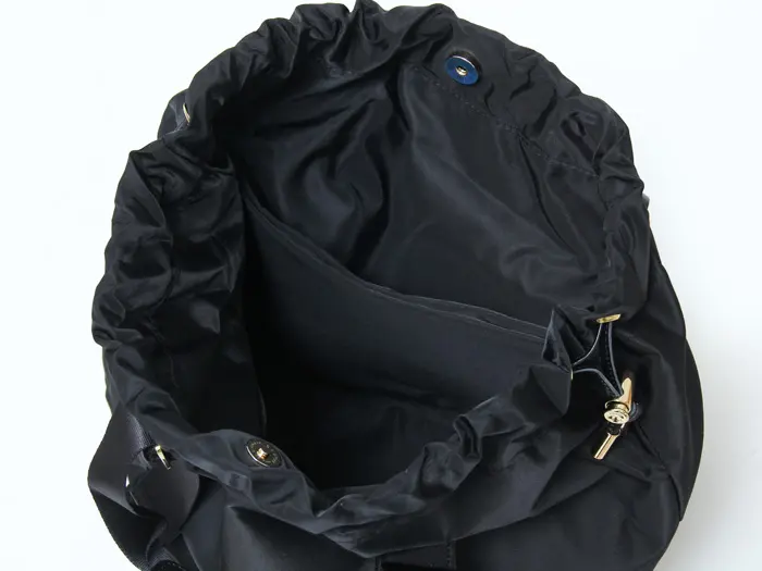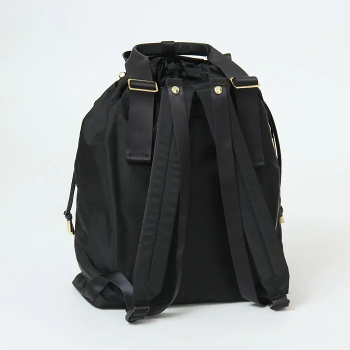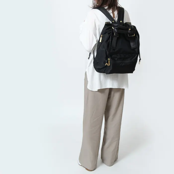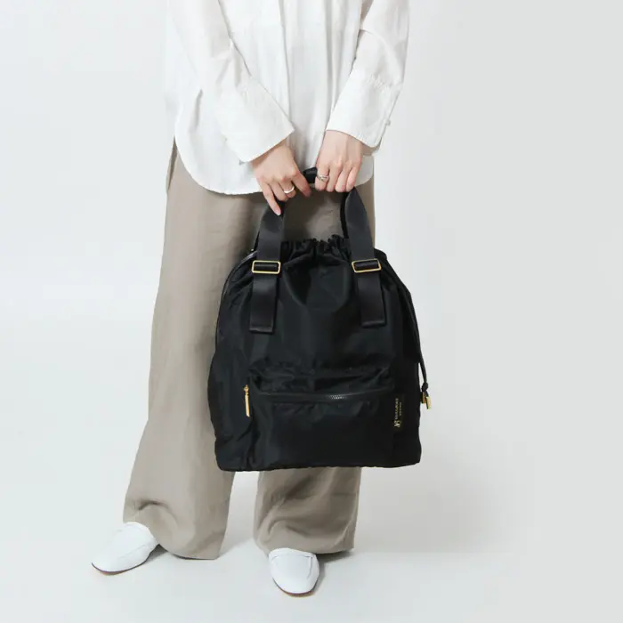 ツヤ感のあるナイロン生地は柔らかく、くしゅっとした表情が軽やかさとこなれた雰囲気を演出します。弱撥水効果があるので、少々の雨にも対応できます。タウンユースからレジャーシーンまで幅広く活躍してくれます。