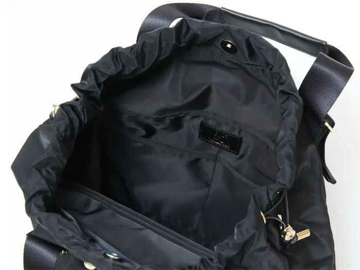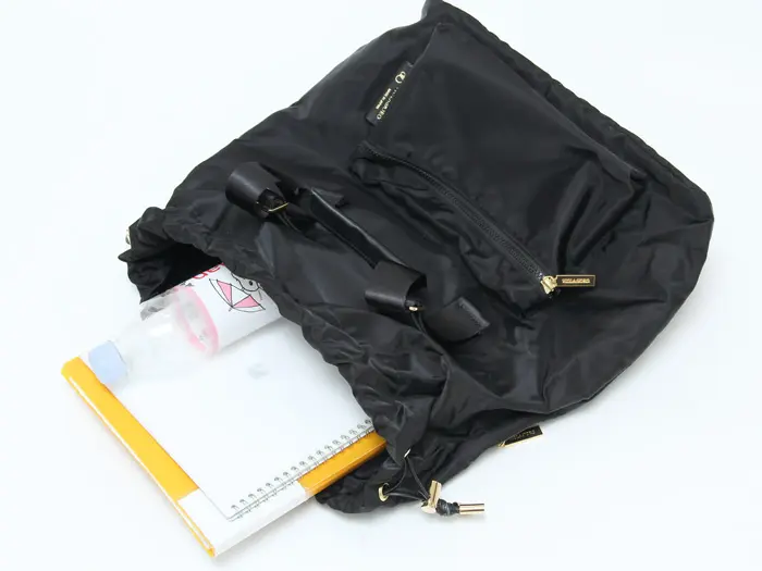 開閉はマグネット付きの巾着仕様。A4サイズが収まる大きさで、マチ幅が広いので荷物がたっぷり収まり、通勤用やお子さんの着替えを入れるマザーズバッグに最適です。背面側の2つのポケットのうち、1つはクッション性のある素材を使っているのでタブレットなどの電子機器を安心して収納できます。正面側の大きさの異なる3つのポケットは小物が整理して収納できます。