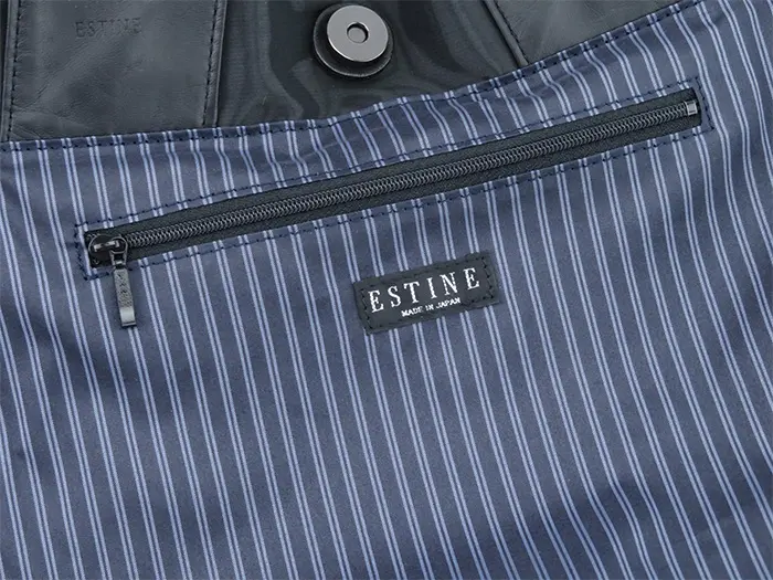 裏地もお洒落なネイビーのボーダーデザイン。正面内側にはオープンポケット2つ、背面内側にはファスナーポケットが1つ備わっているので、小物の収納に便利です。
