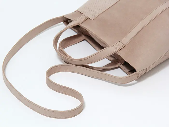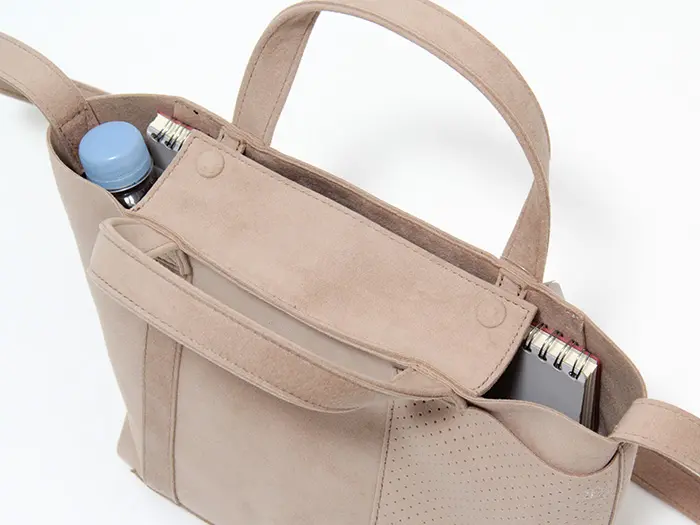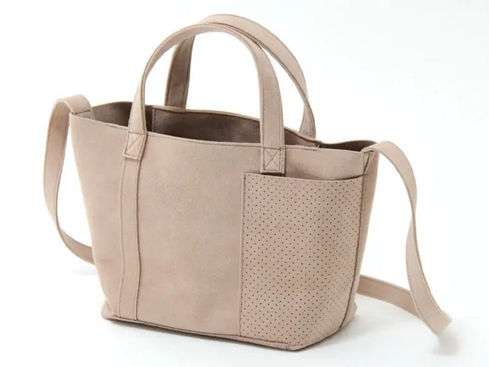 mononogu/もののぐの新しいライン「MNNG」。軽くて、しかも洗える、機能素材“ウルトラスエード”を使用したトートバッグです。シンプルなトートにパンチング加工を施した外ポケットで立体感を出したStuck Tote/スタックトート。デイリーバッグにちょうどいいスモールサイズはB5が収まる大きさでお仕事用にも◎ ショルダー付きで斜め掛けもできる嬉しい2ウェイデザインです。