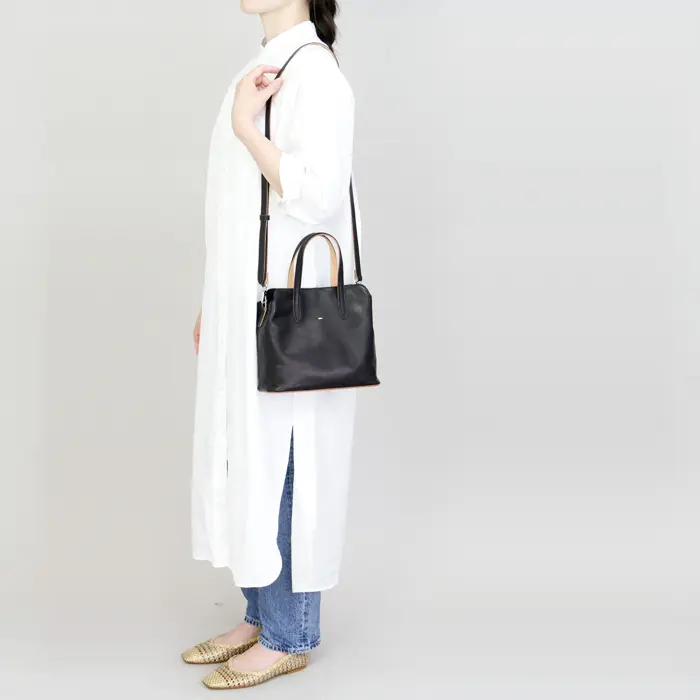 白ヌメ革とのコントラストが美しい本体には素上げ牛革を使用。素上げ革はナチュラルレザーとも呼ばれ、革本来の風合いをお楽しみいただけます。使っていく内に革は柔らかく風合いを増し、タイムレスで長くご愛用いただけます。ぜひ本革ならではのエイジングをお楽しみください。