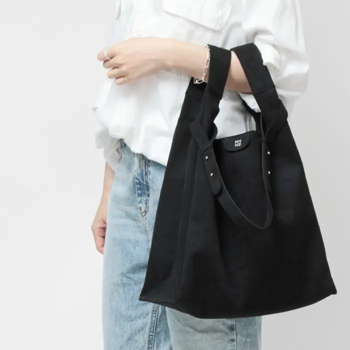mononogu/もののぐの新しいライン「MNNG」。次世代素材のウルトラスエードを使用した、軽量がつ洗濯可能なトートです。歓喜の叫び声『WooHoo!!』を表現したA4サイズも楽々入るラージサイズです。斜めがけや手提げにも対応する2way仕様。軽さと洗濯可能な特徴で、忙しい日常にも対応します。