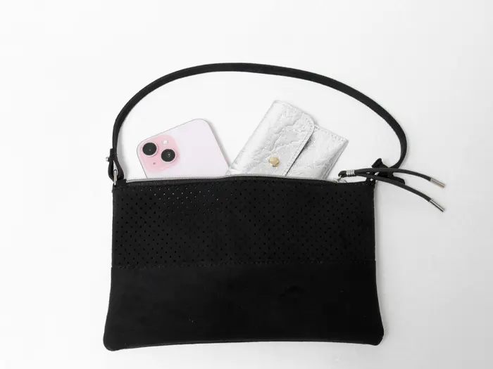 取り外し可能な付属のポーチは、単独でも使用できる便利な仕様で、長財布がすっぽり収まるサイズ感です。バッグの中で探しがちなスマホや貴重品をきちんと整理して収納できるため、使い勝手も抜群。整理整頓をサポートしつつ、デザイン性も兼ね備えたアイテムです。