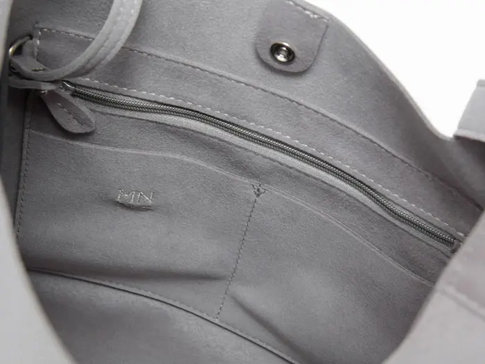 内側には、ファスナーポケットがひとつとオープンポケットがふたつ備えられており、小物類をしっかりと整理して収納することができます。細々としたアイテムも、スムーズに出し入れできる便利な設計です。