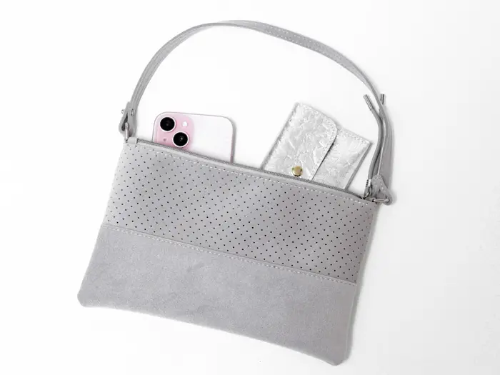 取り外し可能な付属のポーチは、単独でも使用できる便利な仕様で、長財布がすっぽり収まるサイズ感です。バッグの中で探しがちなスマホや貴重品をきちんと整理して収納できるため、使い勝手も抜群。整理整頓をサポートしつつ、デザイン性も兼ね備えたアイテムです。